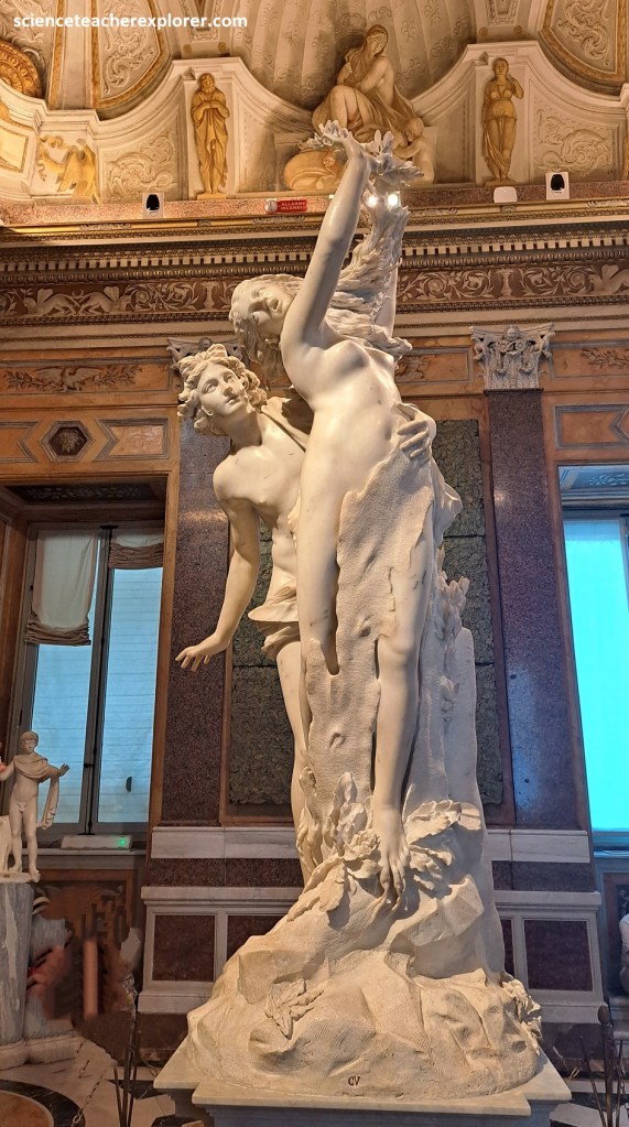 Pictured above, in Room #3, Gian Lorenzo Bernini created, (at the age of 24) an unprecedented masterpiece depicting the chaste nymph Daphne being turned into a laurel tree, pursued in vain by Apollo god of light. Bernini was inspired by a passage in Ovid’s Metamorphoses where a mischievous Cupid holds sway. Apollo is struck by Cupid’s golden arrow of love. Overwhelmed by lust, he chases after Daphne. But Daphne’s simultaneously been stuck by a lead arrow of disgust. She cries out to her father, a river god, for help. He transforms her into a laurel tree.
