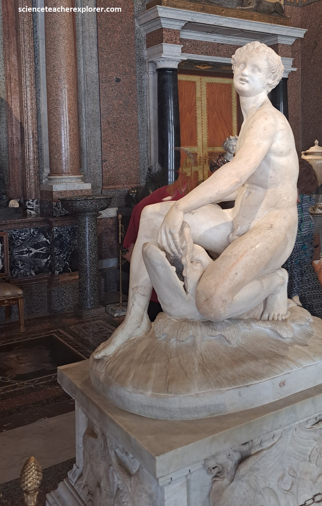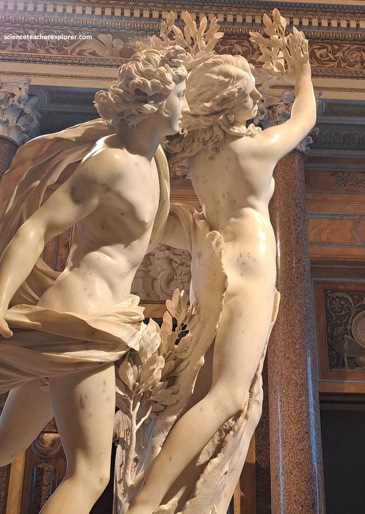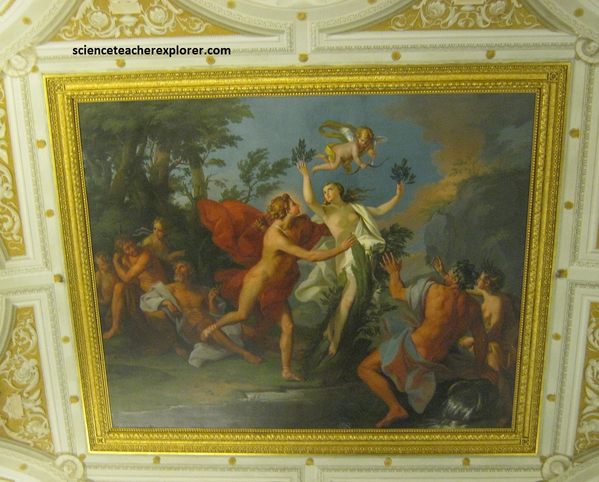 Pictured above, the young Apollo is captured at the exact moment when he reaches his beloved Daphne who is turning into a laurel. Everything happens before the astonished eyes of the God: the feet become roots, the hands become leaves, the hair branches, and the body a rough trunk. I’m amazed of the details depicted, to the fineness of the leaves, the raised foot of Apollo and his sandal, the half-open mouth of the nymph that seems to be screaming. It is hard to believe that it was carved out of marble. Pictured below, I noticed the same scene, colorized, painted on the ceiling above by Pietro Angeletti in 1780.