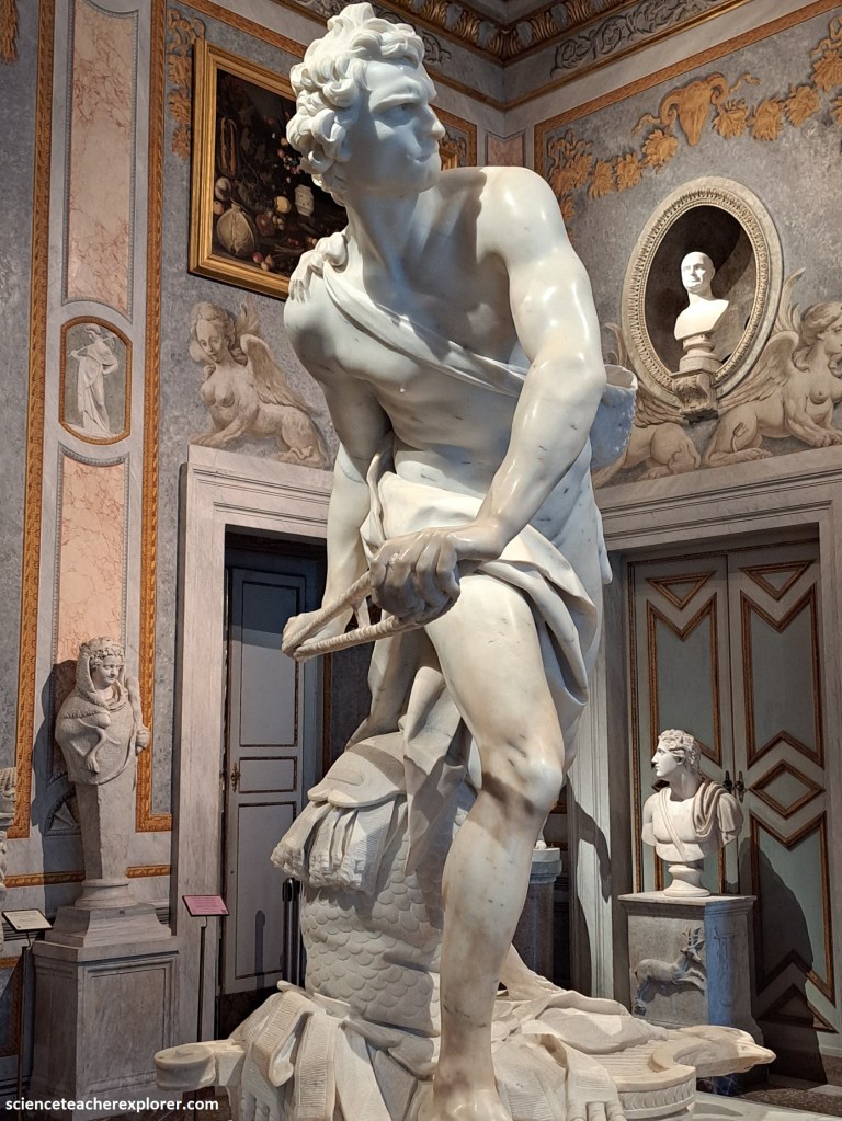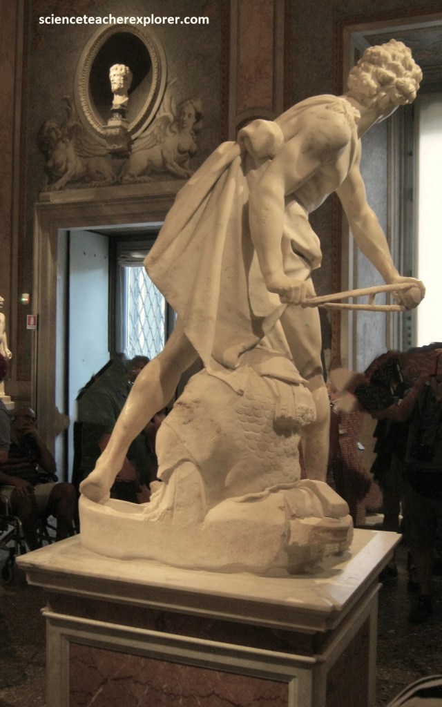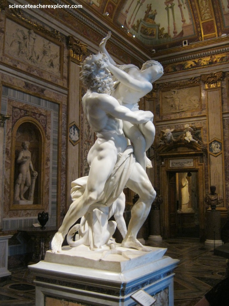 I would classify this statue as one of the best in the world. G.L. Bernini follows another classical theme: Pluto, brother of Jupiter and Neptune, happens upon his niece Prosperine picking flowers and is immediately smitten with her. Losing his head he seizes her and drags her down to his kingdom of the underworld where she becomes his queen. Bernini depicts the scene as the duo arrives at the doorsteps of Hades where Cerberus the three-headed hell hound stands guard.