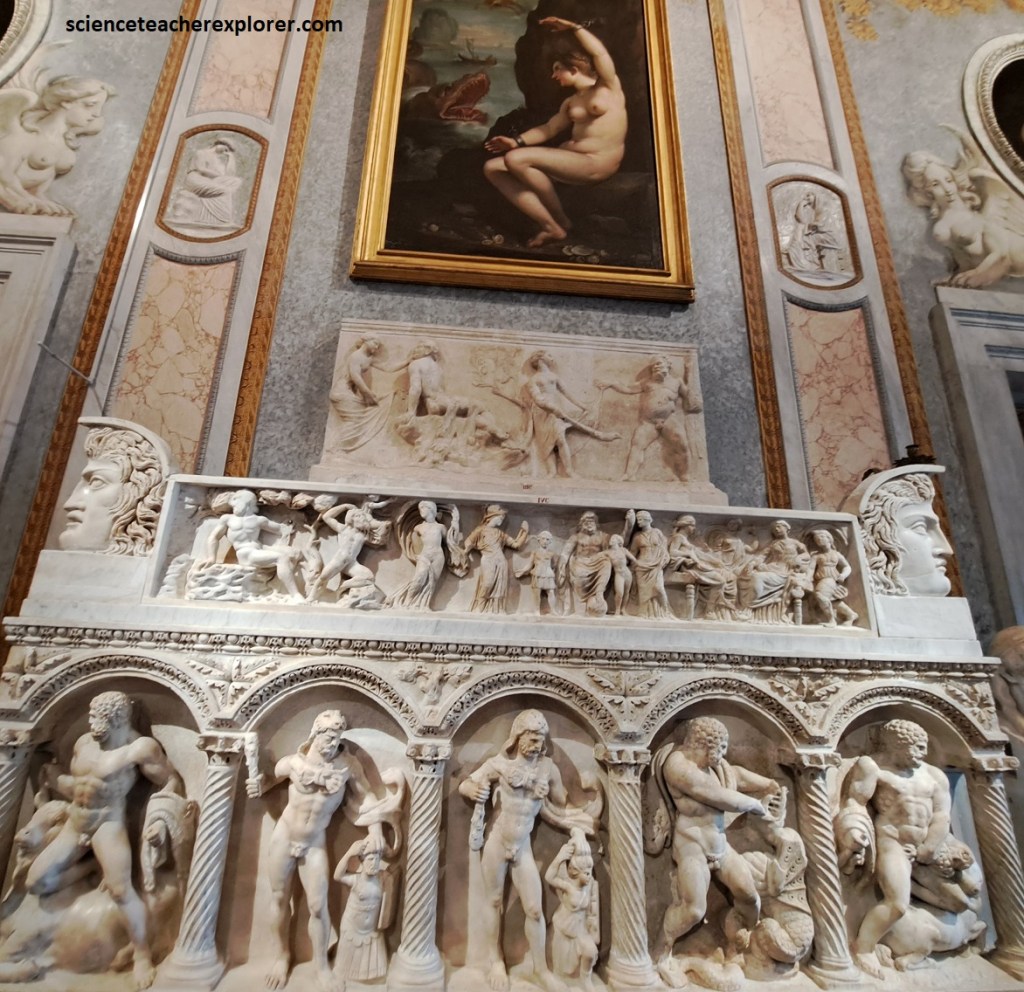 Pictured above in Room #2, the large painting by the Sienese artist Rutilio Manetri, ‘Perseus Freeing Andromeda from the Sea Monster’, also reflects the Baroque style of painting at the beginning of the 17th century. Additionally the front panels of the splendid ancient sarcophagi that are found below the Manetri painting, includes the striking scenes of the labors of Hercules, executed in Asia Minor around 160AD, framed by oriental arches on small columns. Becky and I, then continued to Room #3.