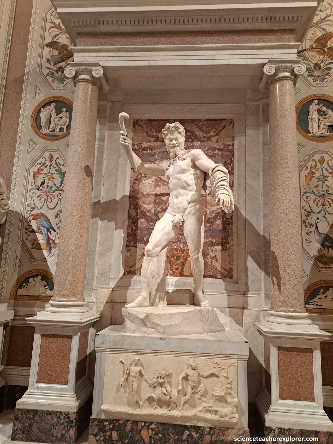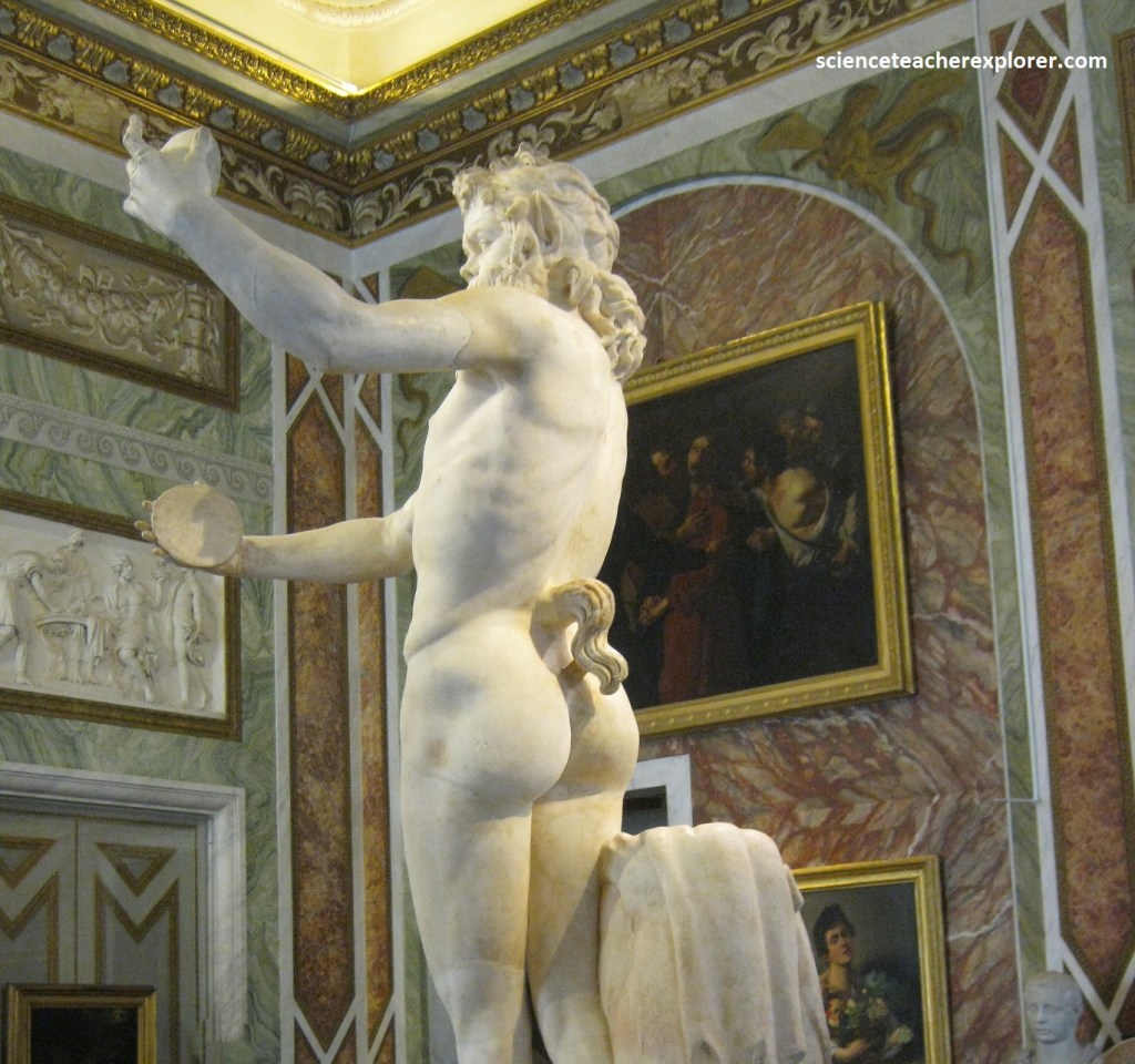 Pictured above, I call this Room #8 the Caravaggio Room because it holds the greatest collection of Caravaggio paintings anywhere. However, it happens to have the statue of the ‘Dancing Satyr’ in the center. It is a Roman sculpture in a twisting pose from the 2nd century AD. The Neoclassical sculptor, Berthel Thorvaldsen, restored the ‘Satyr’, but instead of the original flute, (for Lysippus), his figure is holding crotals, (musical instruments similar to cymbals.