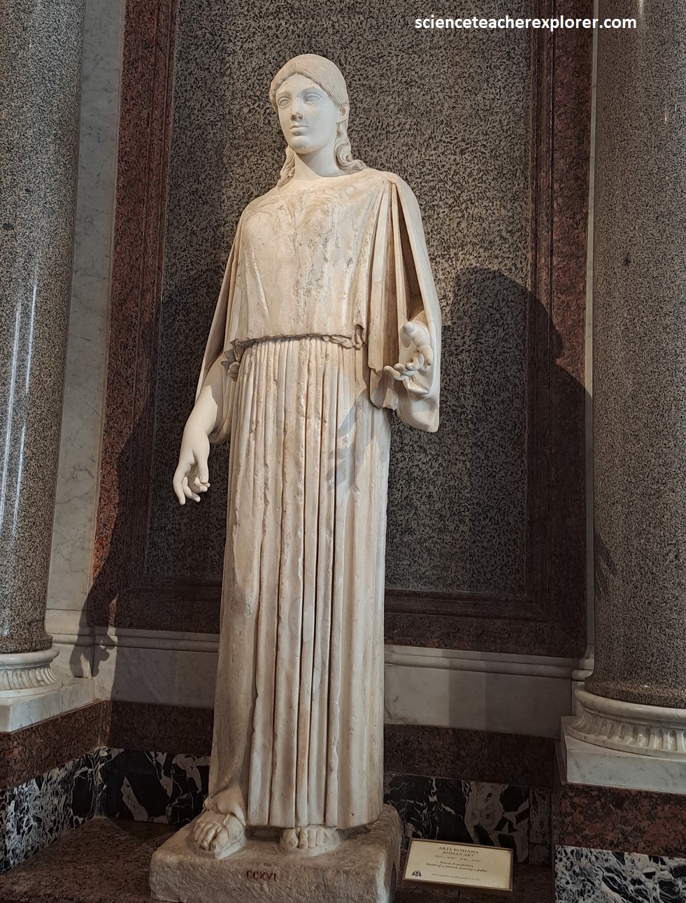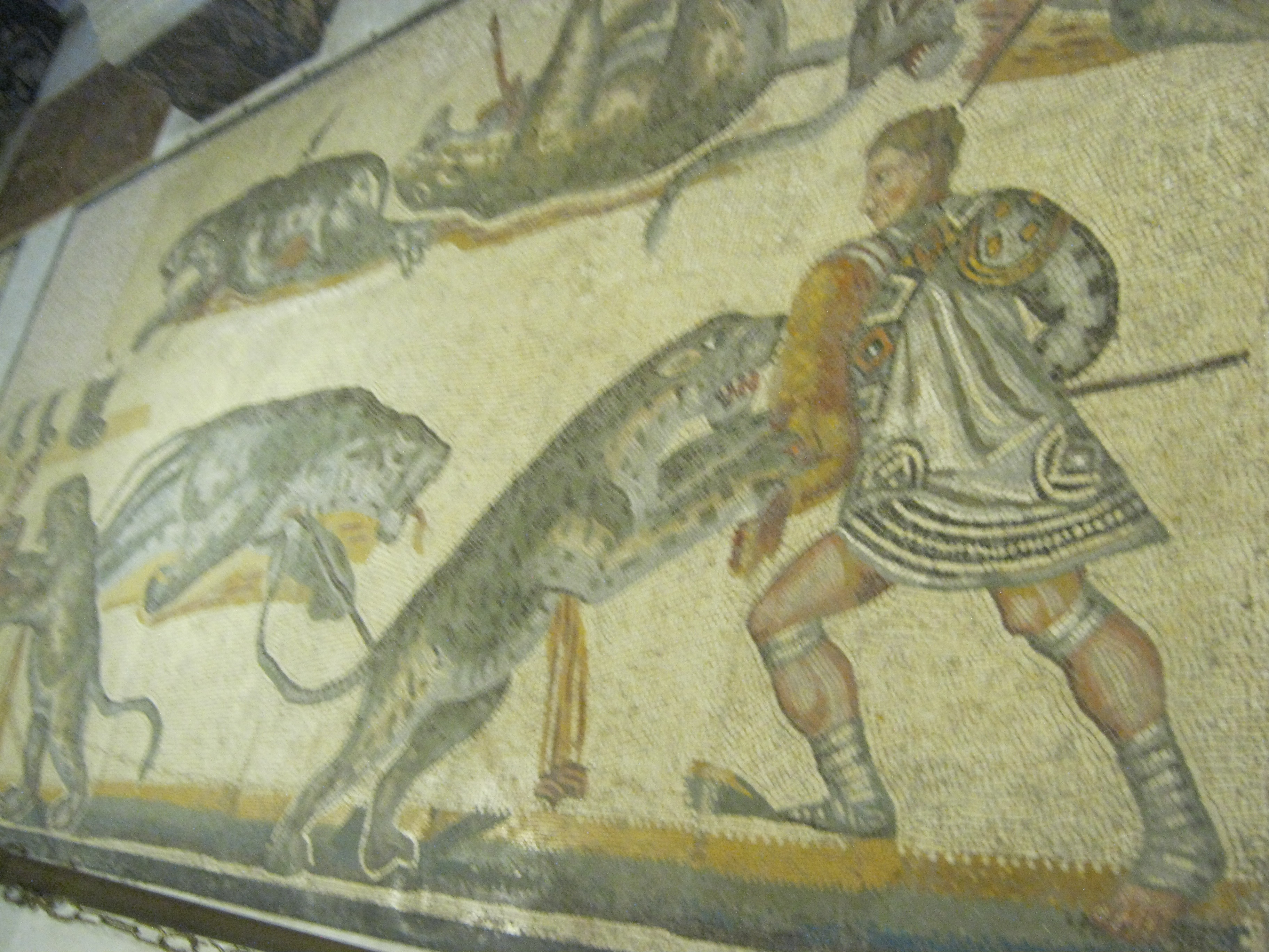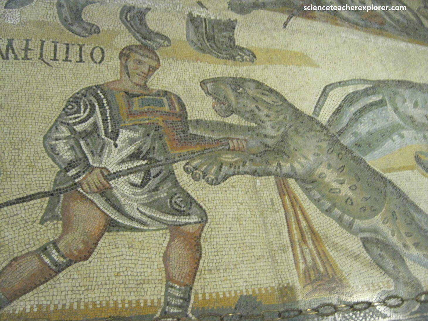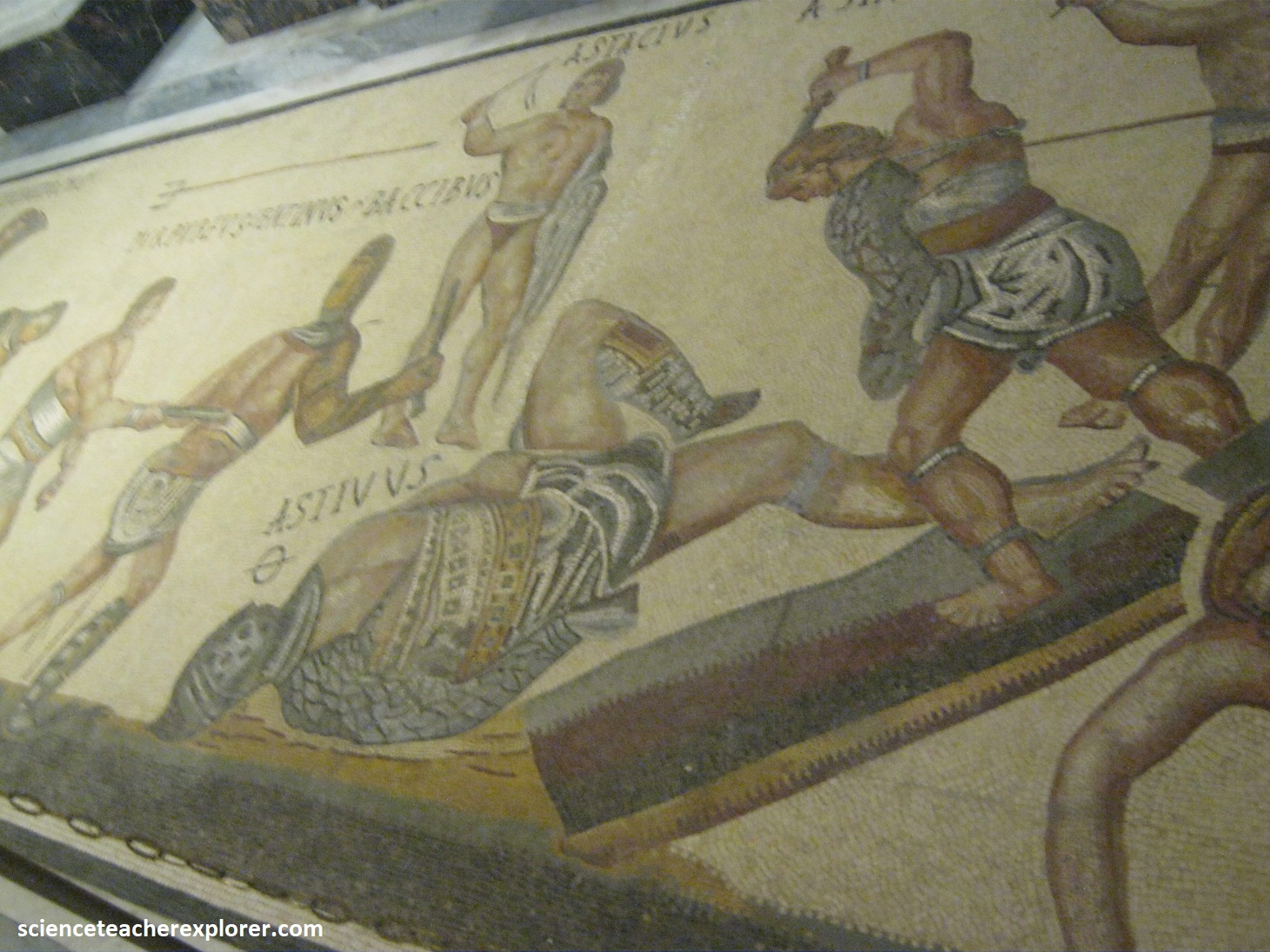 Pictured above, the ‘Main Entry Hall’ floor was decorated with the fragments of a 4th-century AD mosaic, depicting gladiators fighting. These were found in Torre Nova of the Via Casilina and set in the floor of the ‘Entrance Hall’ in the 19th century. Becky and I continued into Room #1.