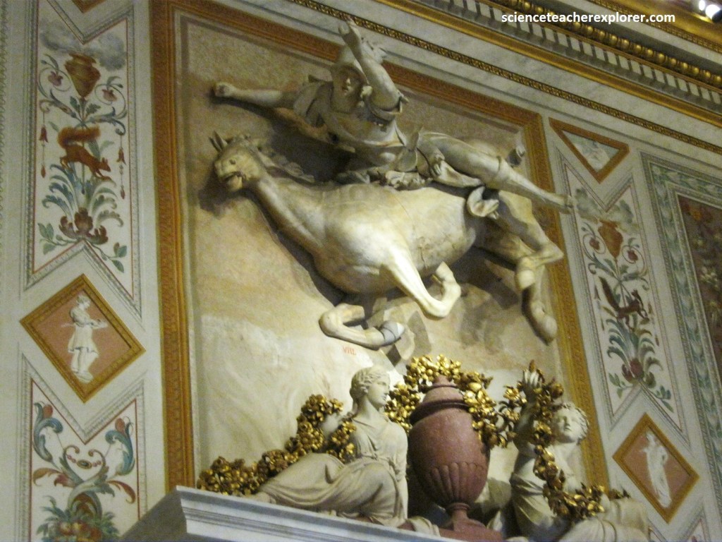 Pictured above, this imposing hall welcomes the visitor to the villa with a celebration of the glory of Roman civilization. Immediately, Becky and I noticed a large equestrian statue, (set high up on the wall), of the hero Marcus Curtius sacrificing himself for his people by flinging himself into the chasm of the Roman Forum after and an earthquake in 362BC. According to the myth: astride his horse, fully and meticulously armed and decorated, Marcus rode and leapt into the chasm where the deep pit closed up over him, saving Rome from Hades. This statue was actually created by Pietro Bernini, father of the famous Gian Lorenzo Bernini.