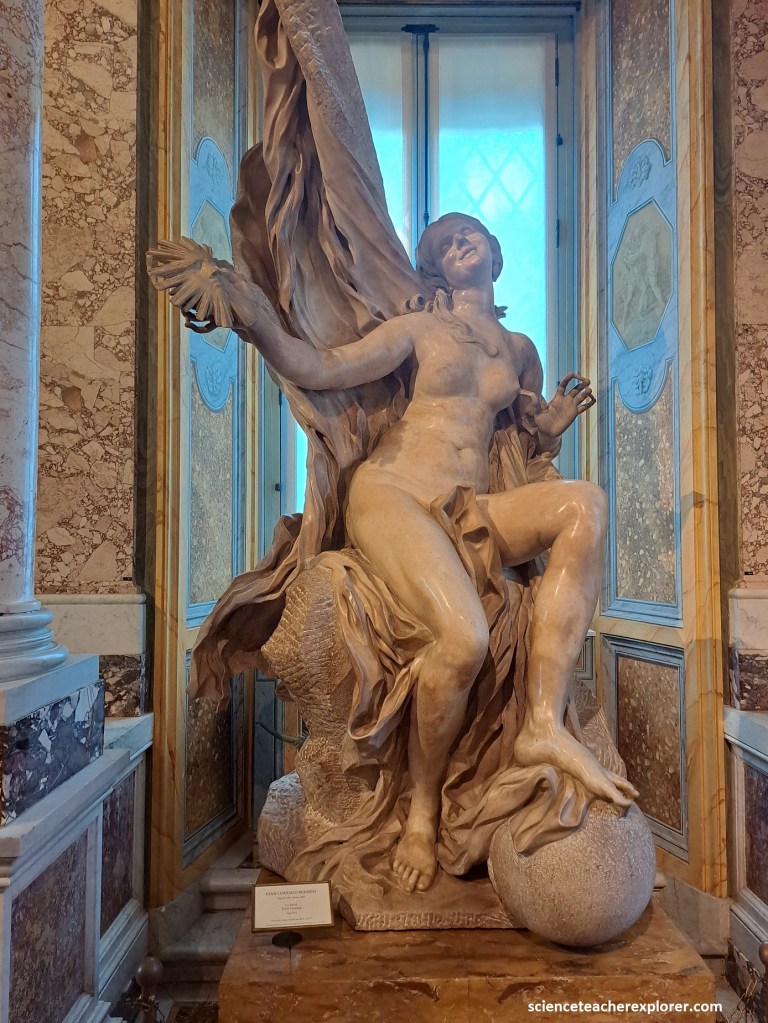 Also found on the western side of Room #6 is the stature called ‘Truth Unveiled by Time’. Another G.L. Bernini statue of marble, it is of a naked young-woman being unveiled by a figure of “Time” above her. Unfortunately, the figure of “Time” was never executed, and the statue remained unfinished. Bernini wanted to add the figure of “Time” to the grouping, but time seems to have beaten Bernini, as he never completed his plan before he died. The female figure is holding the sun in her hand and represents naked “Truth” as her drapery appears to be leaving her body by the invisible hand of “Time”. It is certainly G.L. Bernini’s most personal work.