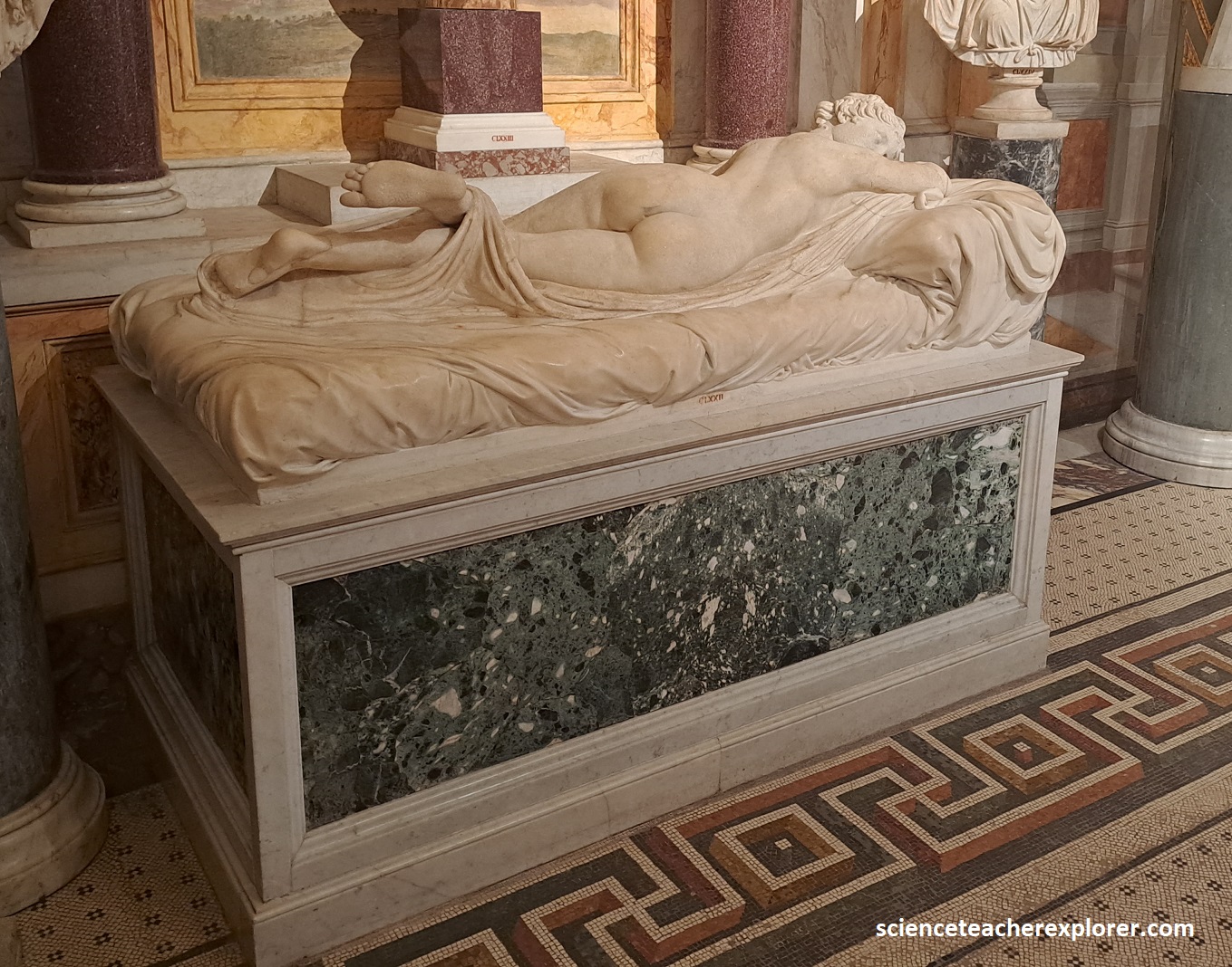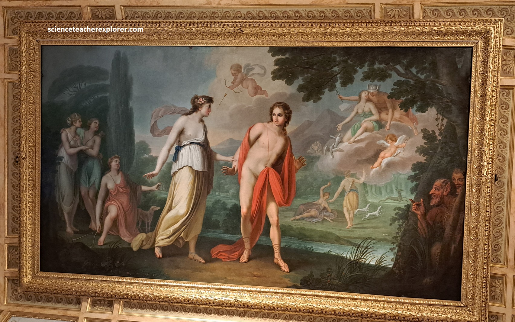 Picture above in room #5, Gian Lorenzo Bernini was asked in 1620, to make the buttoned mattress upon which the 1st century Hermaphroditus reclines, so strikingly realistic that visitors are inclined to give it a test prod. The figure of Hermaphroditos, always portrayed as a female with male genitalia, lies asleep on a messy mattress. The sculpture exudes ambiguous seductiveness. It may appear to be female or male. Then, the scene on the ceiling, (pictured above on the right) depicted the myth of the Hermaphrodite and was painted by Nicola Bonvicini in 1782. According to Ovid’s “Metamorphoses”, the youth’s double nature resulted from his forced union with the clingy water nymph Salmacis. She beseeched the gods to never let them part. Her wish was granted and their bodies were fused.