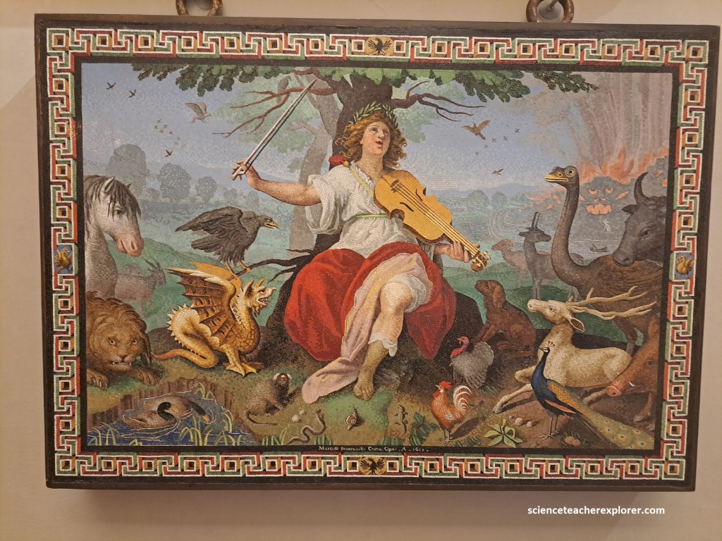 Pictured above, this art-work represents, the cardinal Scipione Borghese, as ‘Orpheus’, (the mythological figure who charmed all living things with his music). It was one of the several pieces made in 1618 by Marcello Provenzale. This mosaic measures (44 x 63)cm . The mosaic pieces are the size of a head of a pin! The artist was known to use different materials in his works: semi-precious stones, glass, and colored ceramics. The tiny-tiles were inserted on a layer of stucco or putty, in a clay base with raised borders, and gone over with wax at the end to polish and minimize the outlines of the tiles. The artistic merit of micro-mosaics was determined by how closely they resembled actual paintings. I thought the ‘Orpheus’ was particularly wonderful in its details and the vivid colors. They should last forever.