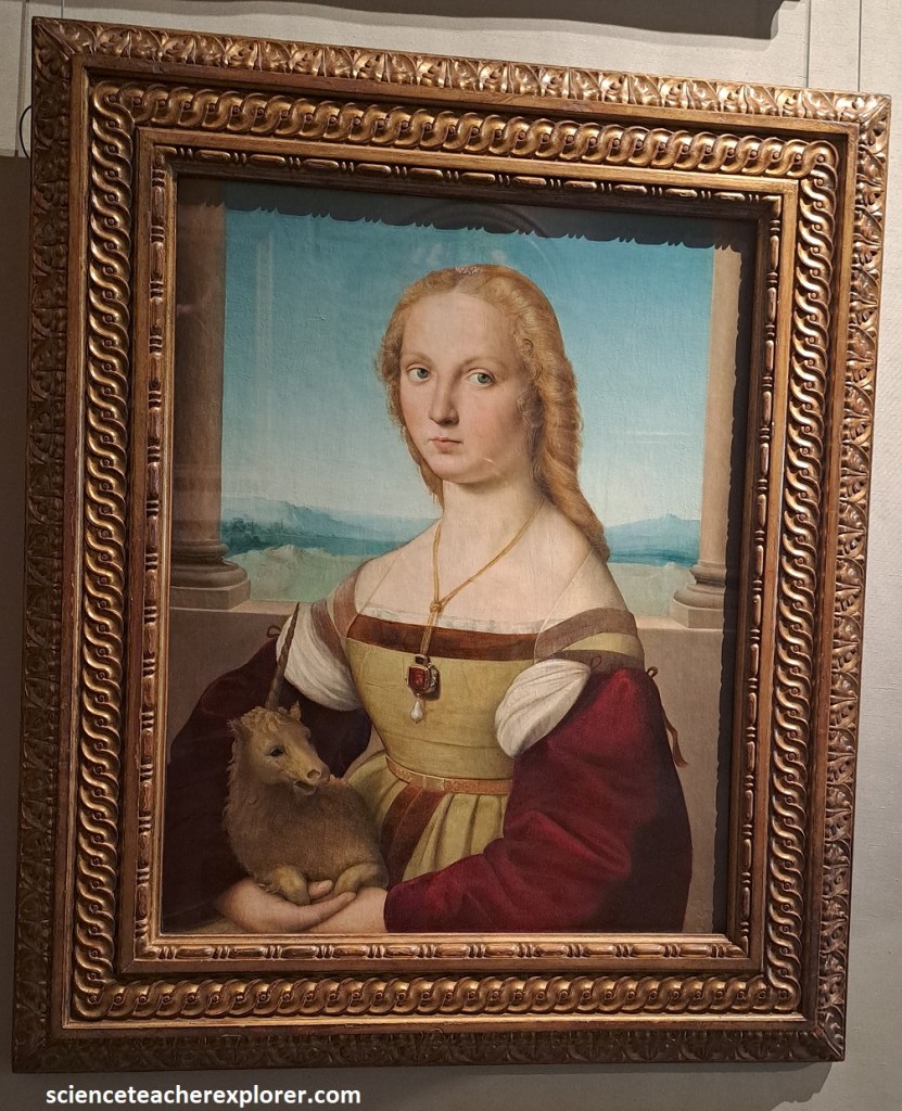 Pictured above is the other Raphael masterpiece found in Room #9. Intended as a wedding gift, this Raphael masterpiece depicts the virtues and symbols of a young bride. The young Florentine woman in the painting symbolizes virginity and spiritual love. Even the unicorn is a symbol of chastity. [Medieval legends held that only a virgin can tame a unicorn].