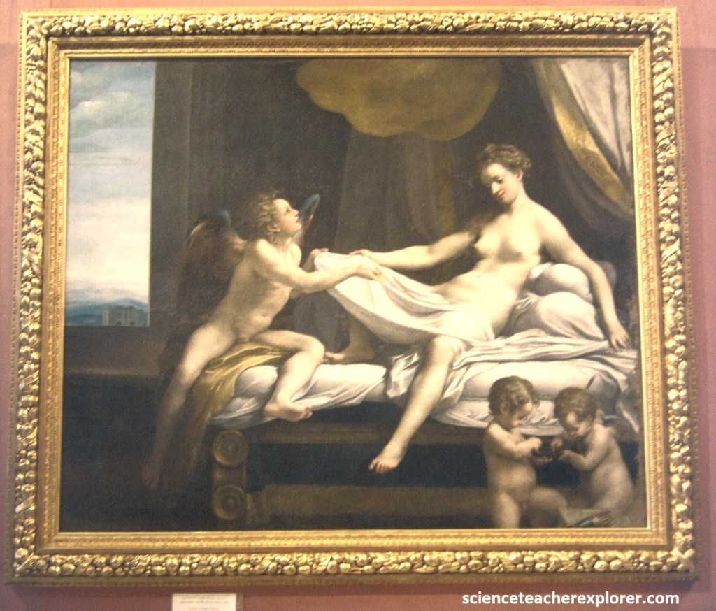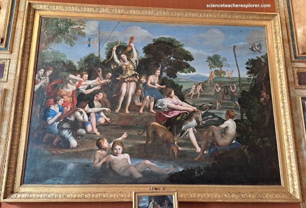A additional painting that Becky & I enjoyed in Room #19 was ‘Diana’. The subject is inspired by a passage from Vergil’s “Aeneid”. It shows relates to an archery competition between Aeneas’ friends. In Domenichino’s ‘Diana’, he revives ancient topics and the embodiment of nymphs. {Domenico Zampieri (1581-1641), known as Domenichino, was an Italian Baroque painter of the Bolognese School of painters}. Pictured above, a nymph holding a greyhound shows us what happens to two male figures hidden in the bushes on the right side of the canvas. According to the myth, her terrible rage of Diana was unleashed against the hunter Actaeon, who, upon seeing her bathing, was turned into a stag and devoured by his dogs. One of the nymphs, immersed in water, gentle and sensual, looks at the viewer and connects the inner and outer spaces of the Baroque artwork.