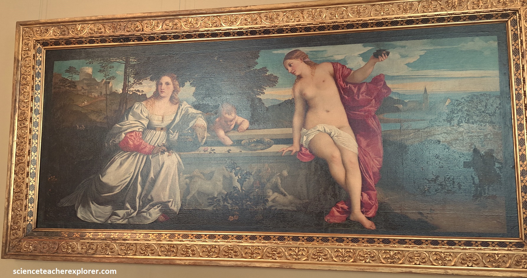 The last room Becky and I explored at the Borghese Gallery was Room #20. There, we found two major masterpieces of Titian. Tiziano Vecelli or Vecellio (1488/90-1576), known in English as Titian, was an Italian painter during the Renaissance, considered an essential member of the 16th-century Venetian school. Titian was one of the most versatile Italian painters who was famous among his contemporaries as “The Sun Amidst Small Stars”. Pictured on the above-right is ‘St. Dominic’. [Saint Dominic was a Castilian priest and founder of the Dominican Order who is believed to have been immortalized by the renowned Venetian painter Titian]. Pictured on the above-left is the ‘Sacred and Profane Love’. As its title implies, the painting presents two forms of love. Sacred love stands on the right with a church in the background. Profane love, in the guide of a bejeweled woman, sits on the left. A baby Cupid plays in the middle, an ambiguous combination of the two. Another ambiguous feature is that the women are sitting on a tomb filled with water.