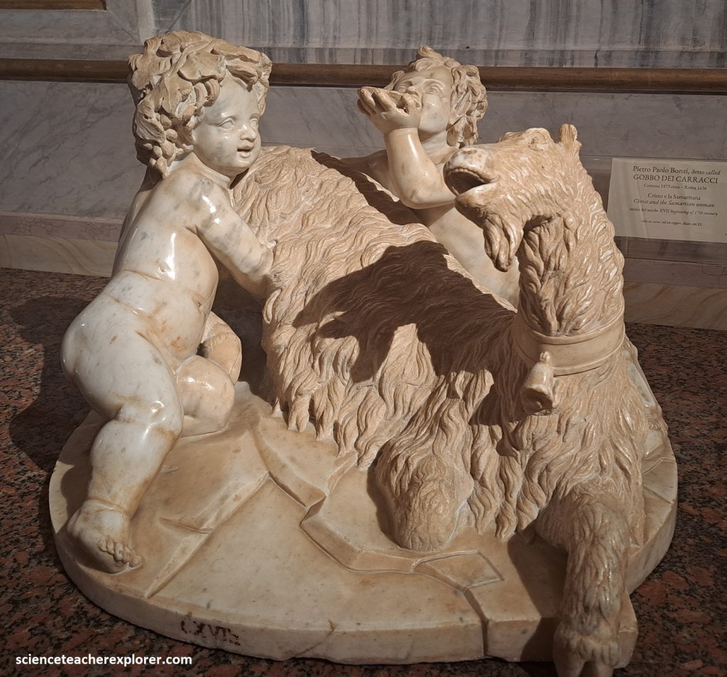 As we were walking through Room #14, Becky and I discovered this little treasure. Pictured above, this small sculpture was created by a teenage Bernini, who was a child prodigy. It’s significant because the sculpture is Bernini’s earliest identified work. The sculpture is based on the Greek myth where Cronus eats his children so they won’t murder him as prophesied. To protect her son Zeus from Cronus, Rhea hides him in a cave on Crete. Young Bernini gives the classic myth a Roman spin by making the two young boys as putti, (children who sometimes appear as cherubs or cupids). The goat looks almost motherly in this case.