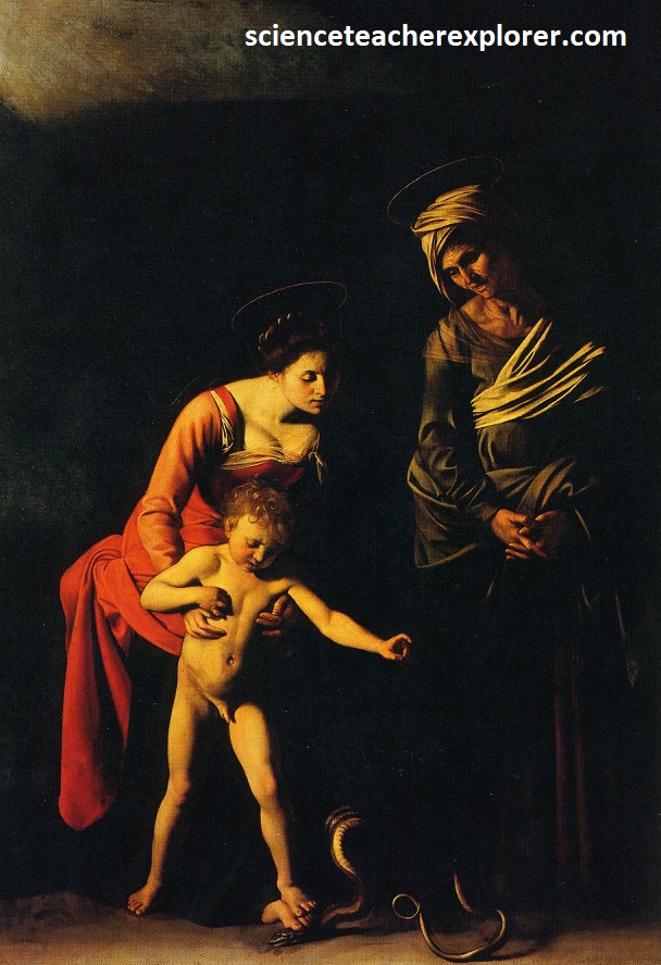 Pictured above, is ‘Madonna of Palafrenieri’ and Child with St. Anne, one of Caravaggio’s religious works that helped keep him become rich and famous. He was commissioned by Cardinal Scipione Borghese to create a painting for the St. Peter’s Basilica. However, he just couldn’t be conventional. Instead of showing St. Anne, Mary’s mother, as a divinely personage, he paints her as an elderly hag. Add to that Mary’s cleavage and Jesus’ uncircumcised little penis and you know why the Vatican was glad to sell it back to Scipione just a few years after its showing. Obviously the snake was meant to symbolize evil and Satan. However, I feel it is his most beautiful work.
