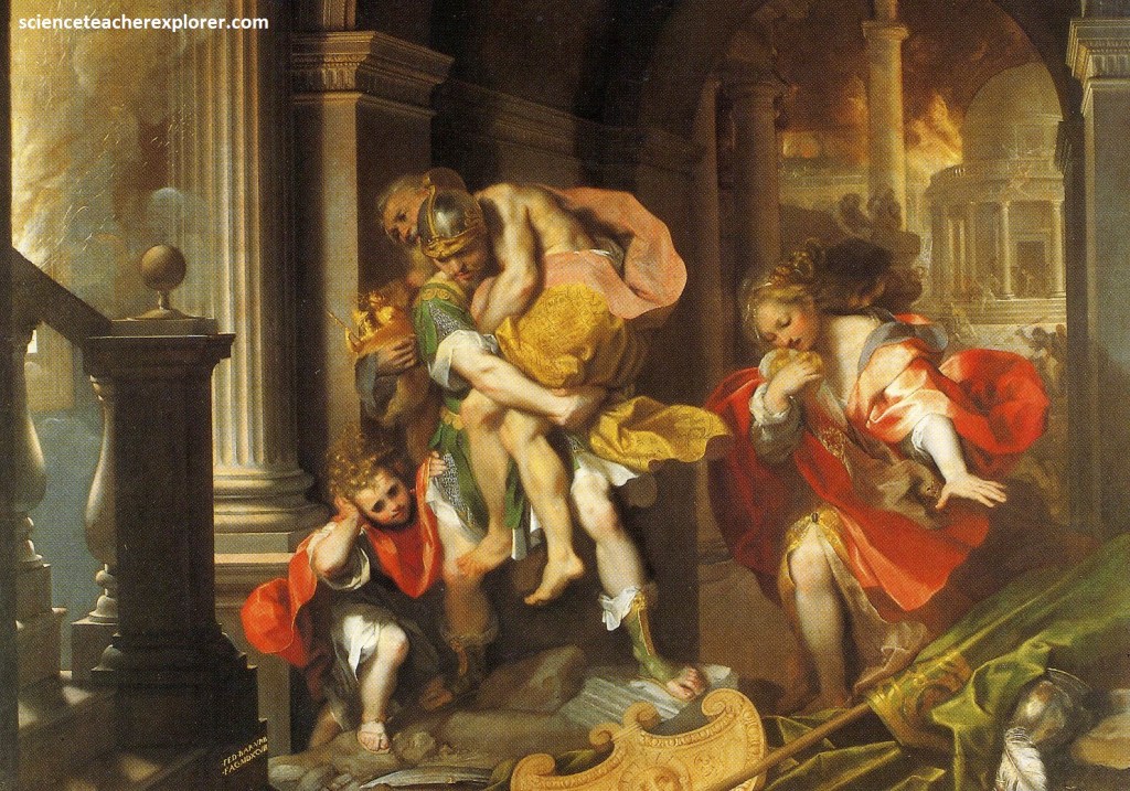 Looking for masterpieces, Becky and I continued walking through the rooms upstairs at the Borghese Gallery. We found Federico Barocci’s, painting, ‘Aeneas Fleeing from Troy’, in Room #19. It was a remarkable artwork measuring 176 x 253 cm. It was Barocci’s, (an Italian Renaissance painter), only attempt at historical narration. The scene shows that Aeneas leaves the city of Troy with his wife Creusa and his son Ascanius. He was trying to escape the fire, which has already begun to burn the round temple in the background. On his shoulders, he carries his father, Anchises. [Note that the complex division of space, the movement of runaway figures, and their clothes of pastel shades foreshadow the stylistic features of Baroque art].