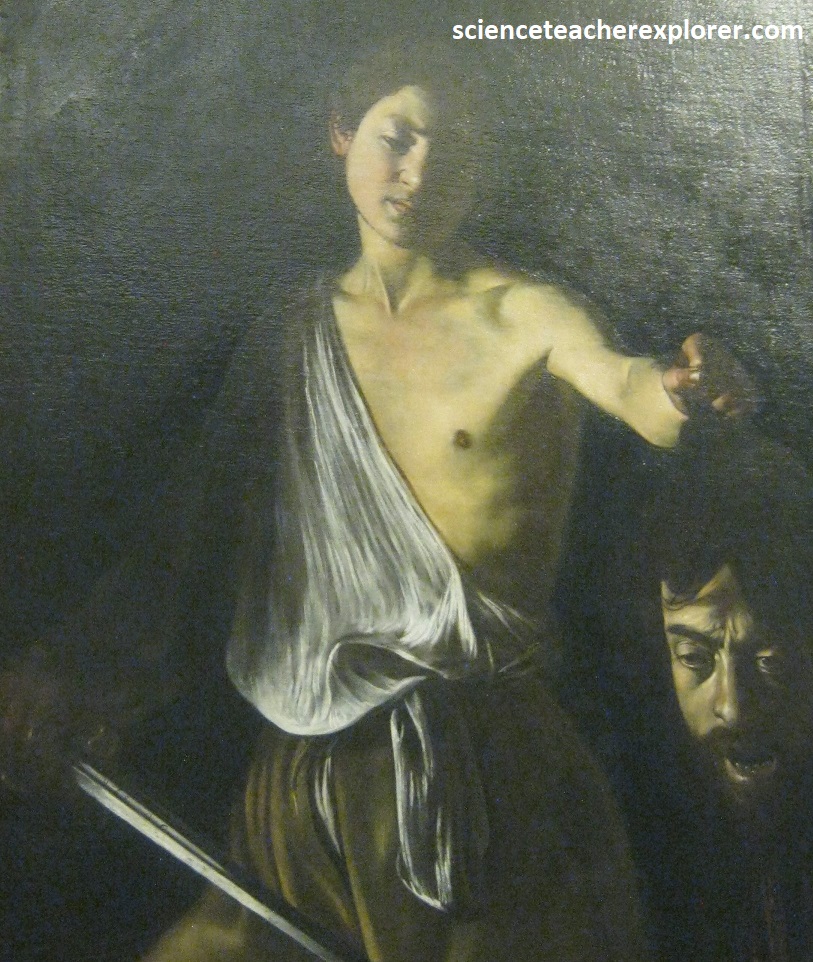 Pictured above in the center of Room #2, this sculpture, by G.I. Bernini (1624), captures the moment just before David attacks Goliath with a rock. Bernini modeled David’s face on his own at the age of 25. The oversized cuirass leant to David by King Saul before the encounter lies on the ground with the harp David will play after his victory.