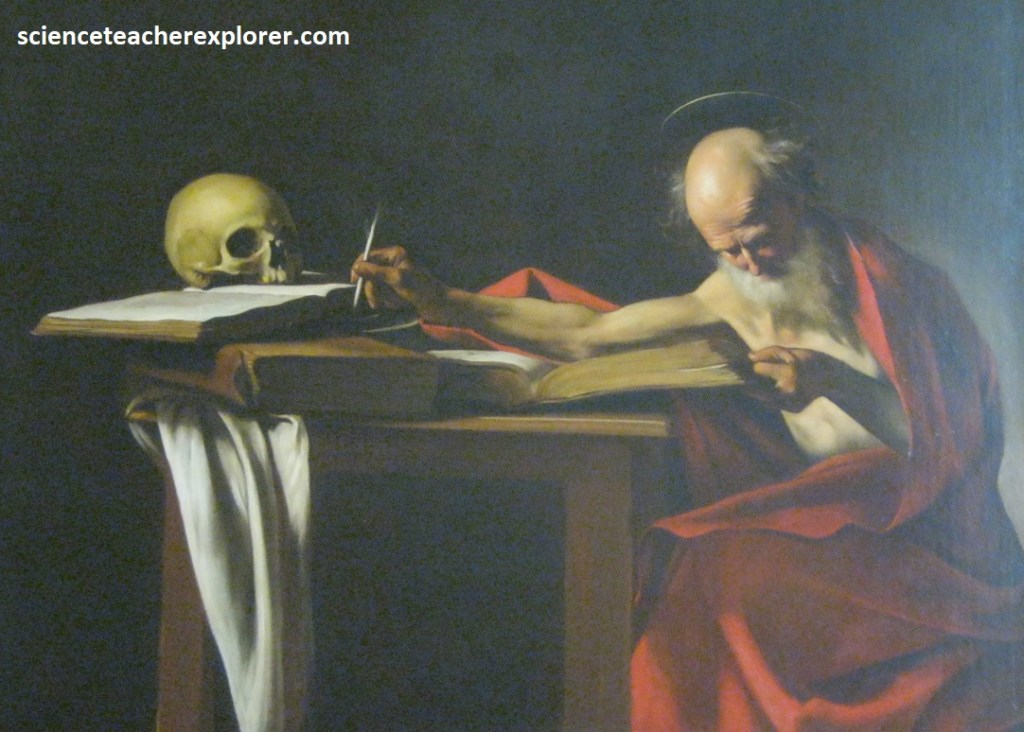 Eventually, Caravaggio pioneered Baroque painting, much as Bernini soon would do with sculpturing. Caravagio’s unique style combined two striking elements: uncompromising realism and strong light-dark contrasts. Pictured above, Caravagio’s ‘Saint Jerome’ of 1606, has his saint balding and wrinkled. St. Jerome was a Roman priest who translated the bible into Latin. He innocently stretches out an arm to refill his writing quill, thereby drawing your attention to the skull.
