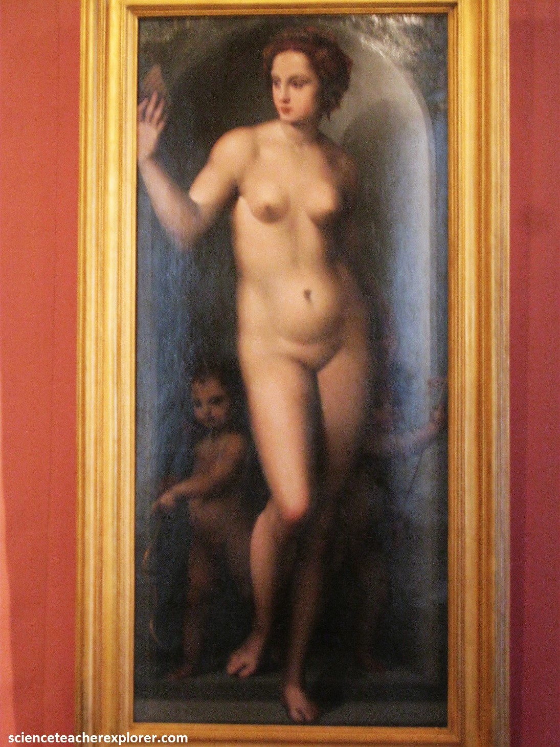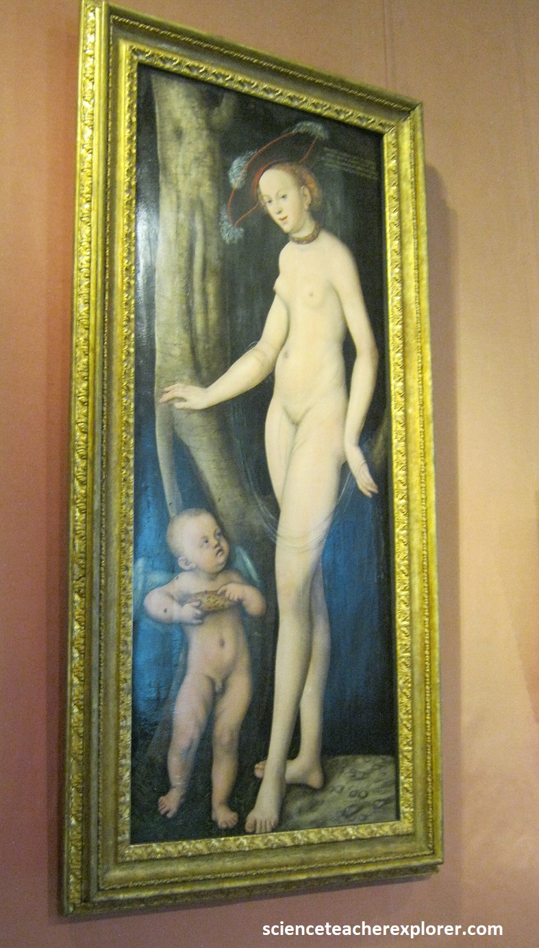 Pictured above, the early 16th-century paintings in Room #10 were by Florentine masters and painters from the Parma, Bologna, Brescia and Genoa schools, and include a ‘Venus’ by Cranach, (left) and a ‘Venus’ by Brescianino, (right) which were displayed together. Brescianino (a painter from Siena), painted the ‘Venus’ around 1525, creating the illusion of a life-like figure looking into the mirror in the seashell as though about to step out of the niche, and flanked by cupids with tousled hair. Around 1531, Cranach (a leading Flemish-painter of the German Renaissance) on the other hand, painted a ‘Venus’ draped in a transparent veil gazing directly at the spectator. In contrast to her nudity, she wears an elegant red hat with crane feathers and a necklace of gems that reflects the Gothic style. At her feet, the winged infant Cupid looks up at her mother and is holding a honeycomb with a swarm of bees landing on his arms. His expression is sullen from the bee stings, and he is turning to Venus for comfort but she does not seem to display any compassion.