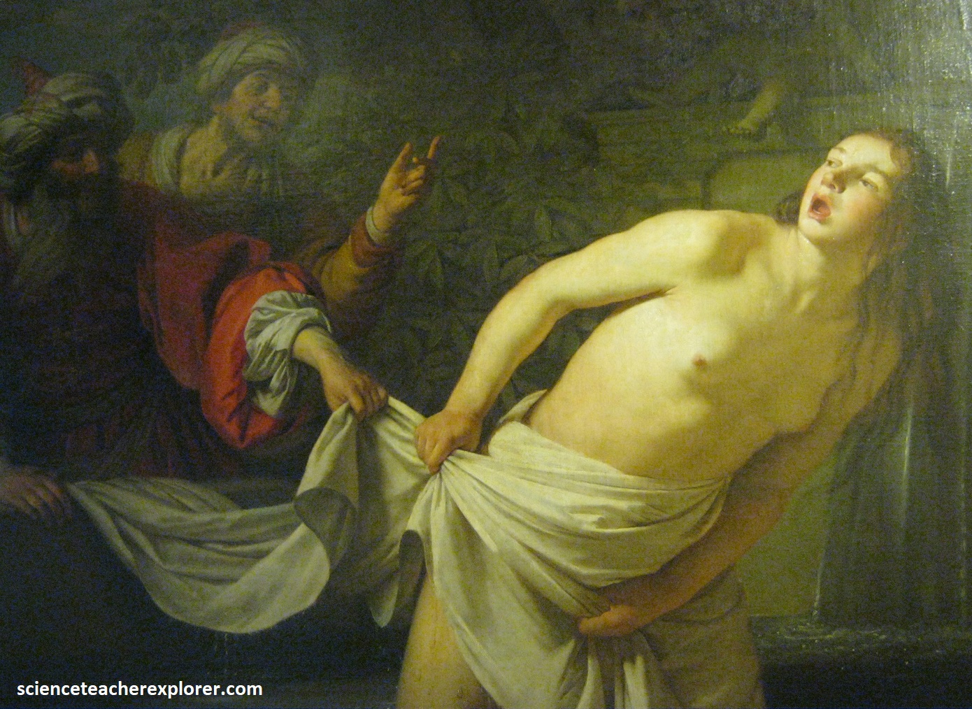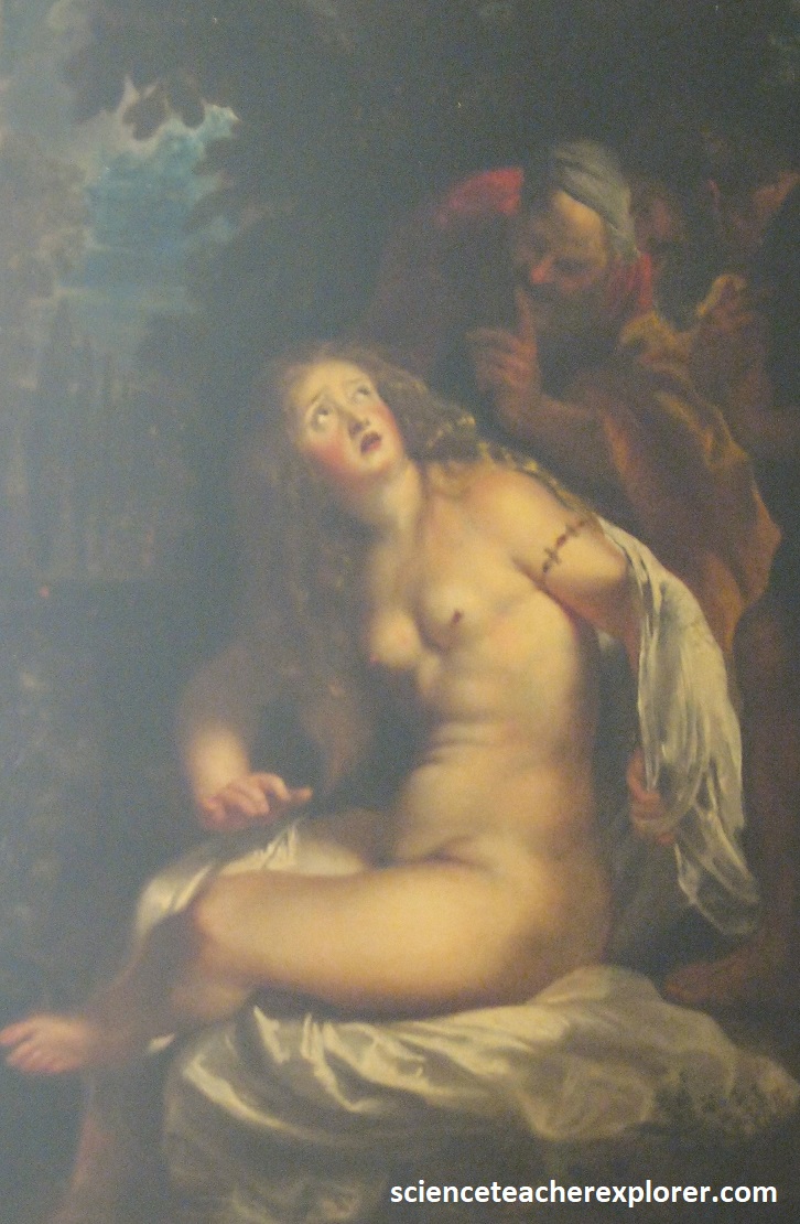 Pictured above are two paintings we found in Room #18 called ‘Susanna and the Elders’. [Susanna and the Elders is an Old Testament story of a woman falsely accused of adultery after two men who, after discovering one another in the act of spying on her while she bathes, conspire to blackmail for sex]. The painting on the left was created by Pieter Paul Rubens in 1602 and the painting on the right was created by Gerrit Van Honthorst in 1655. In both paintings, Susanna has a white cloth draped over her. The white symbolizes her purity and goodness because she did not commit adultery, just like the elders are planning to accuse her of. However, her face implies that she is shocked that the elders observe her bathing. She also looks frightened since she does not know what the elders aim to do to her.