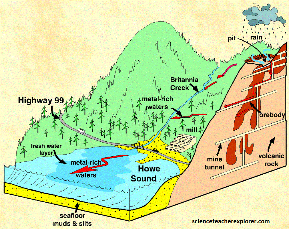 Since 2004, the skilled professionals at EPCOR ensure the polluted mine water is clean before it enters the local waterways. Imaged above, when water enters the mine, it forms Acid-Rock Drainage, (acidic water contaminated with dissolved metals). The job of the Britannia Mine Water Treatment Plant is simple, (to make the mine water safe for aquatic life). To contain the polluted water, the old mine tunnels are used as a reservoir. The water flows from one exit into the treatment plant. Here, the acidity is neutralized and the metals are removed. The water, now safe for marine life, then flows into the Howe Sound.