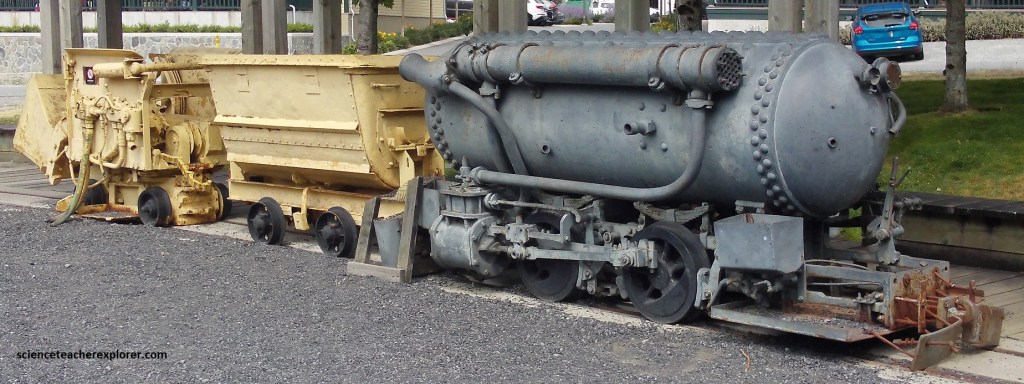 The Britannia Mine featured over 160km of underground workings, including tunnels, raises, and shafts across a 3700m horizontal range. Miners used horizontal tunnels (adits) to access ore bodies within the mountain. Ore was transported out via an early haulage tunnel system, often using mine trains. Becky and I got a chance to take a train-ride into the underground mine and walk around a-bit to explore the different machinery use within the mine, (pictured below).