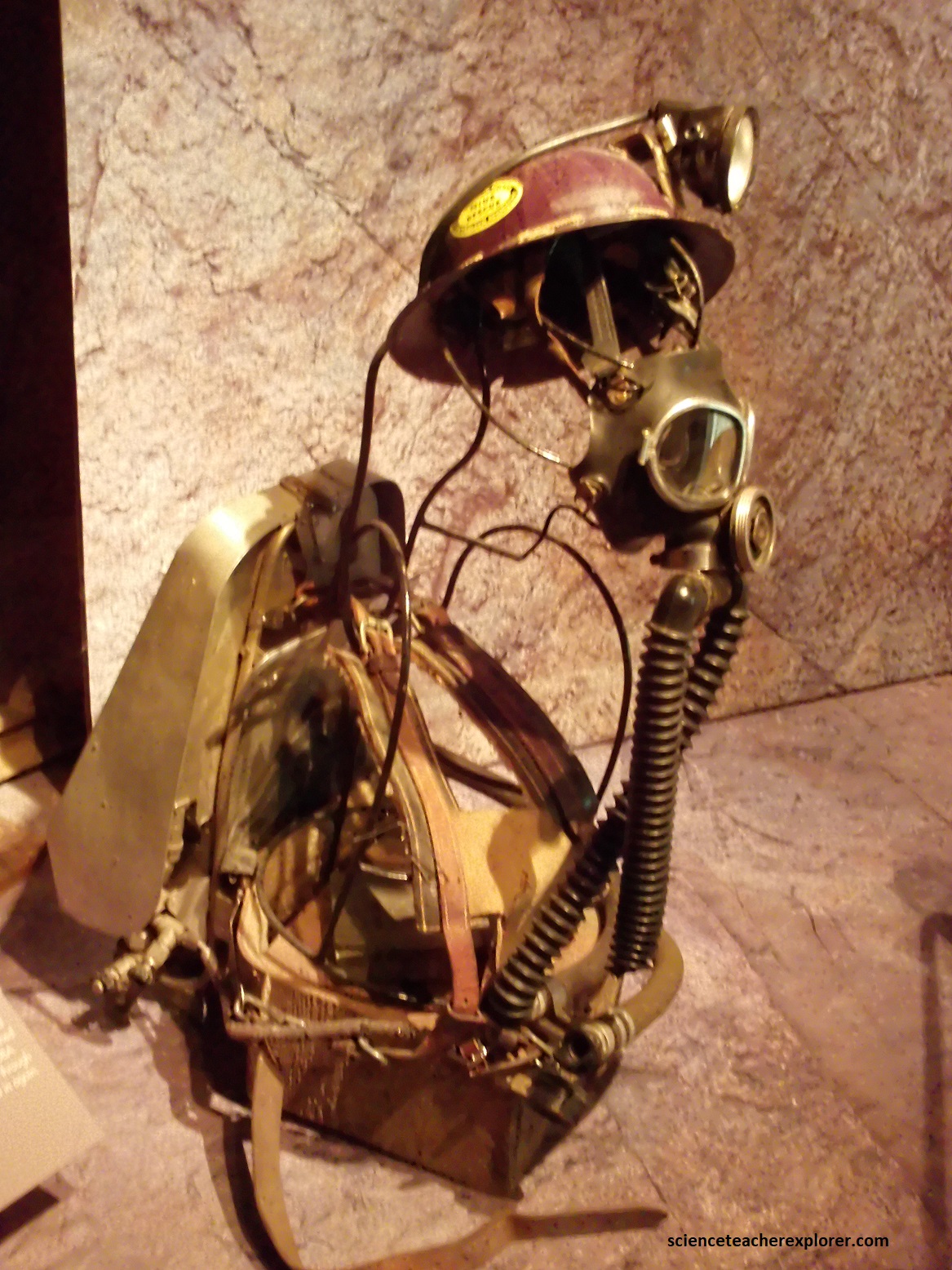 Pictured above, the ‘Ambulance Car’ transported injured workers to the surface. It is a poignant reminder of the dangers faced in mining. There were only 98 deaths that occurred underground over the 70 years the Britannia Mine was working. Picture above on the right, mine rescuers used breathing devices like this one, (introduced around the 1940s). Air breathed out was not lost as in SCUBA diving, (it was recycled through the unit and breathed in again).
