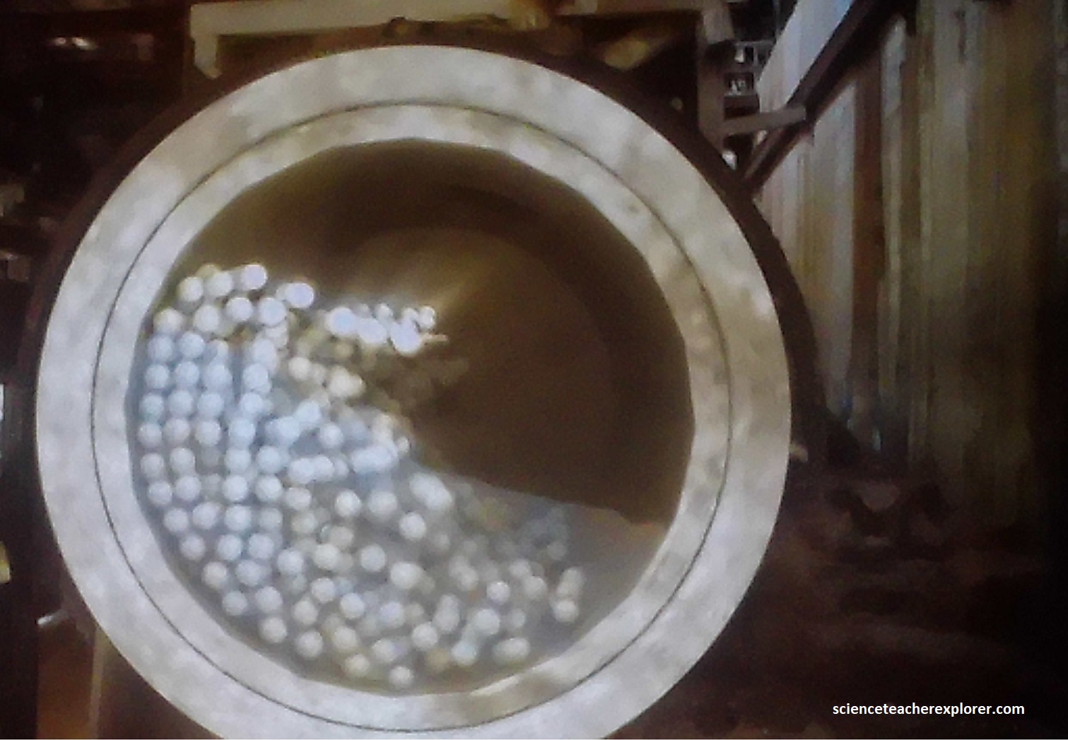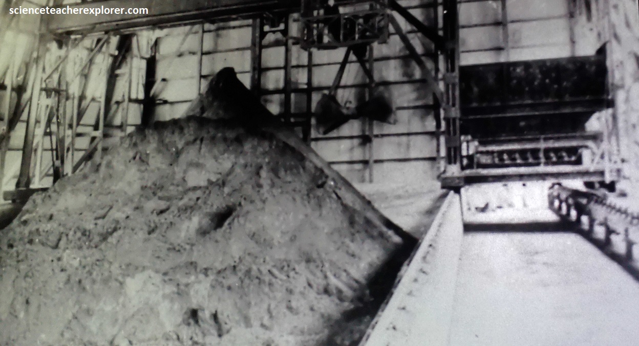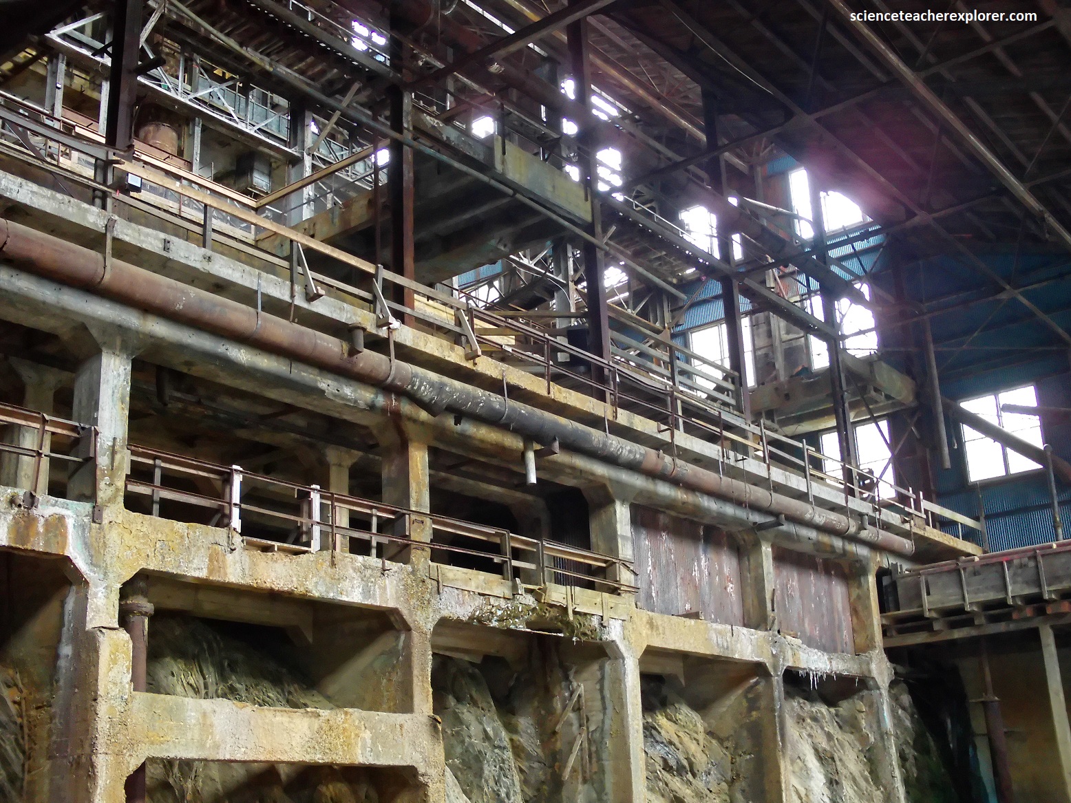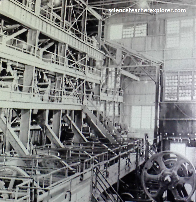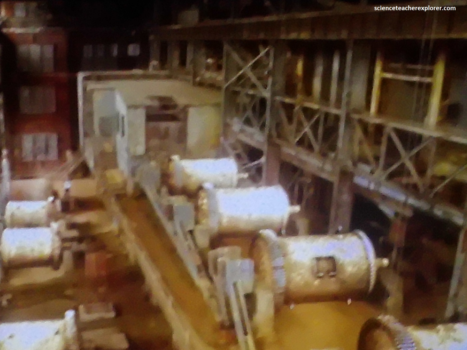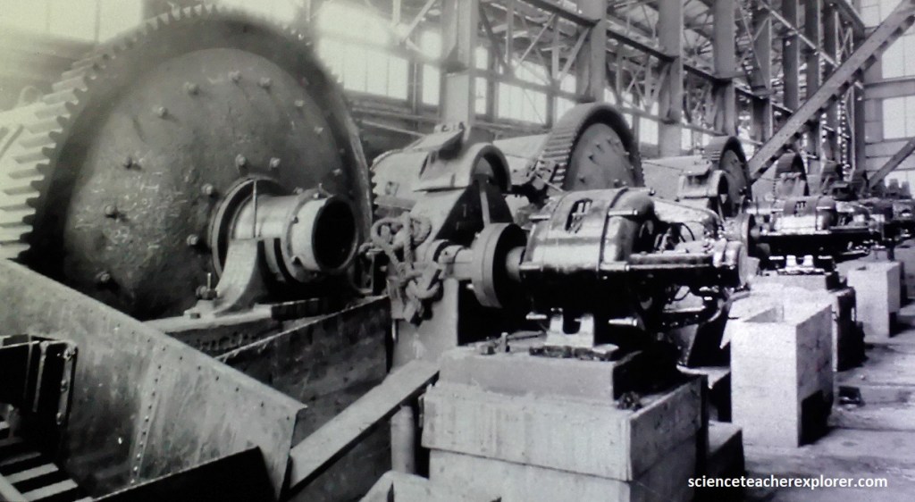 The ore then entered ball mills, (large, rotating drums filled with steel balls). These rocks are then pulverized and ground into a fine powder as thin as flour, {Images below were taken from an interpretive sign on-site}.