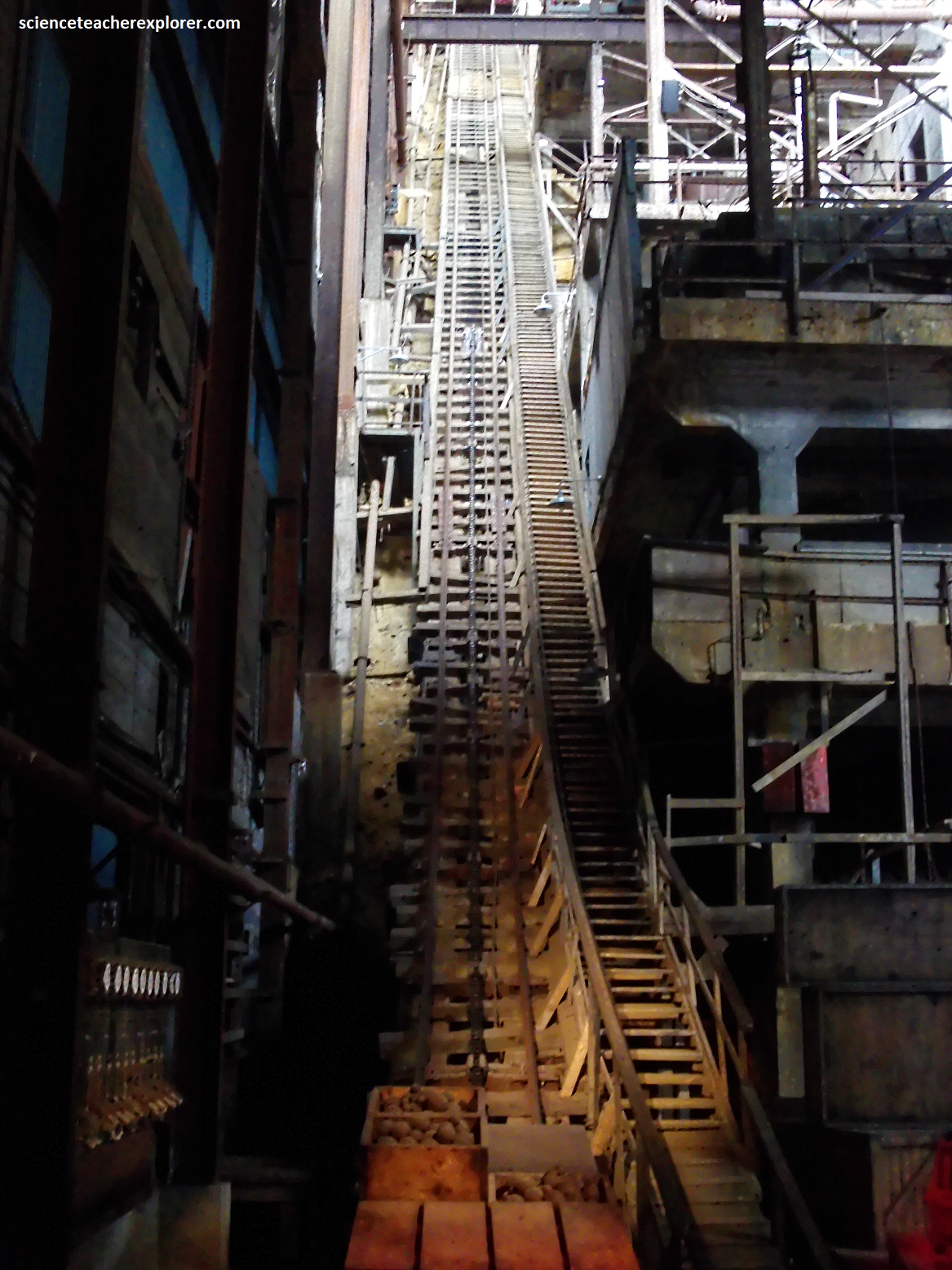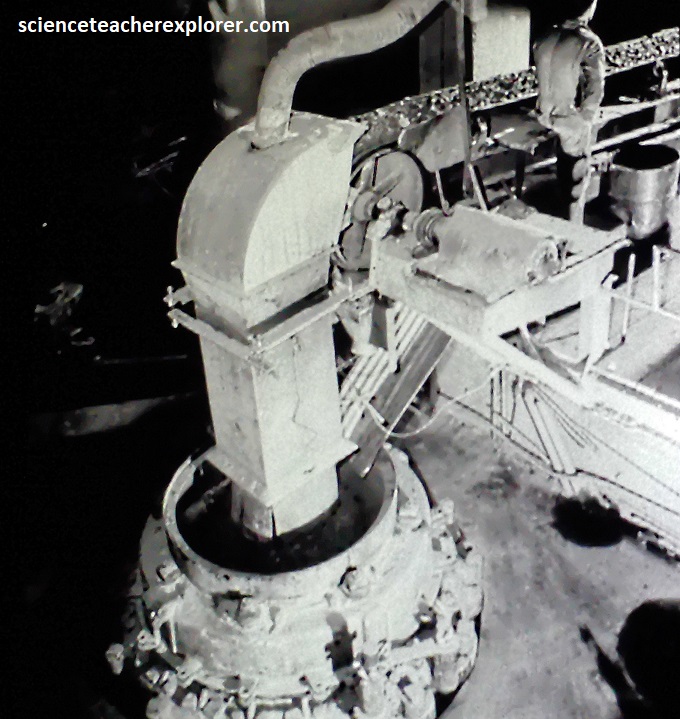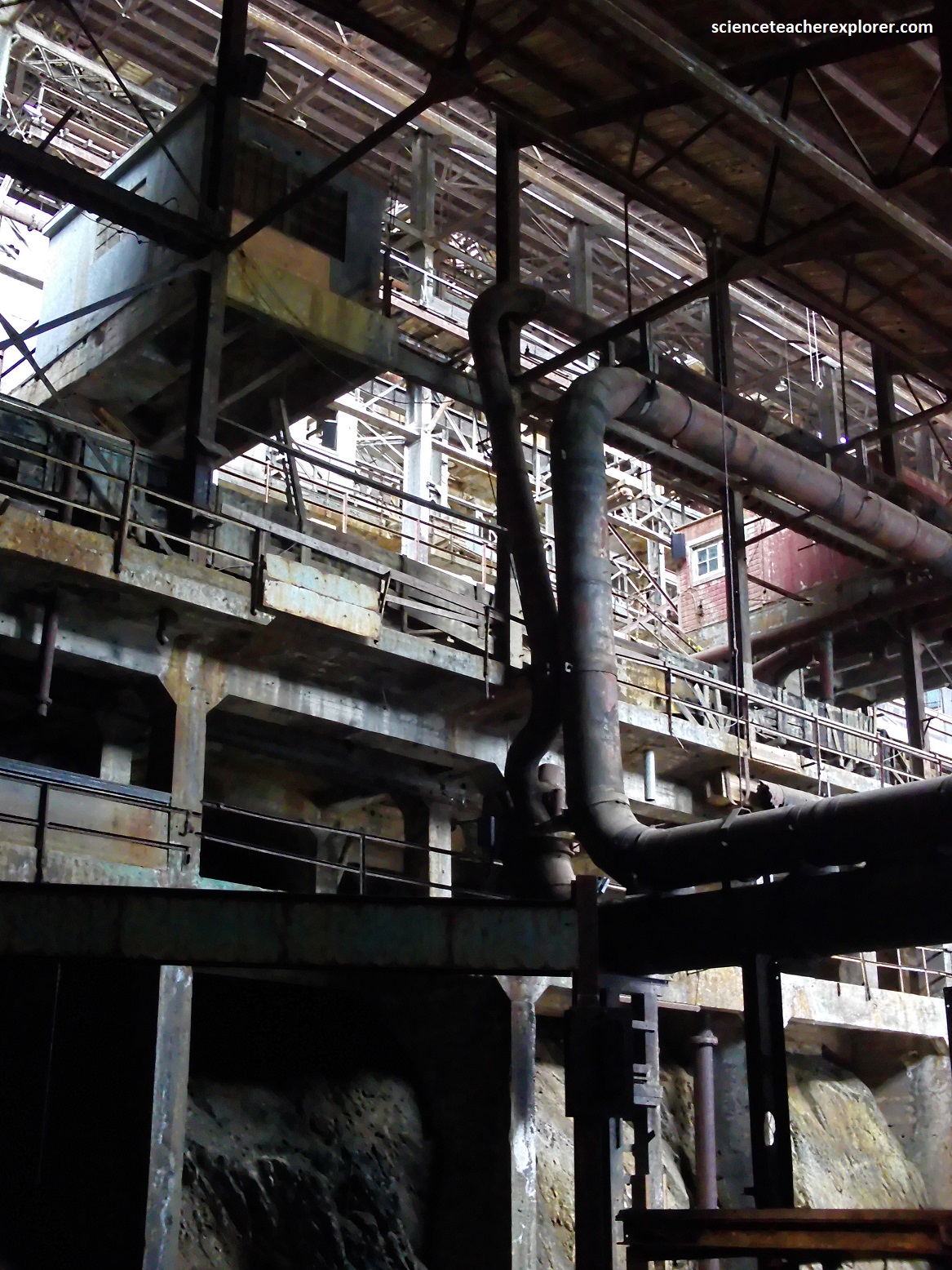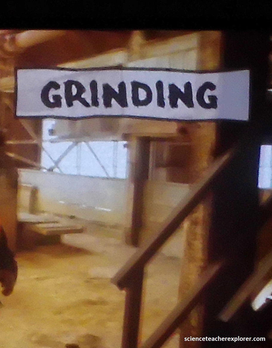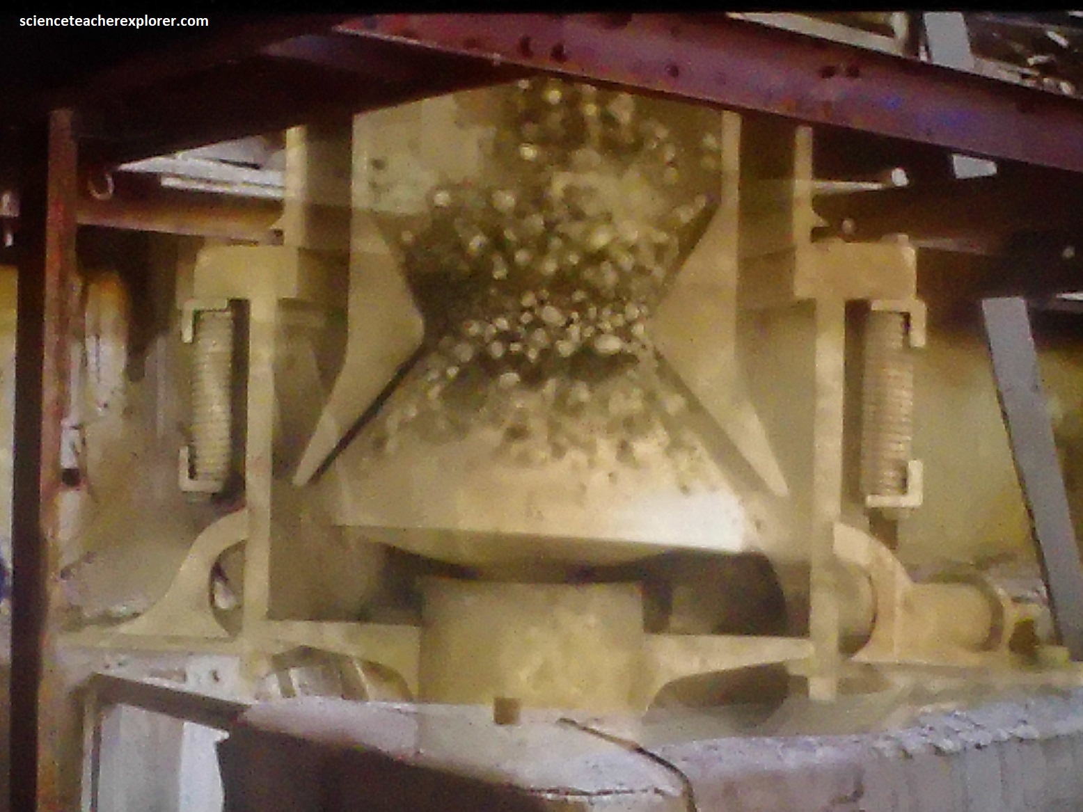 The ore then entered ball mills, (large, rotating drums filled with steel balls). These rocks are then pulverized and ground into a fine powder as thin as flour, {Images below were taken from an interpretive sign on-site}.