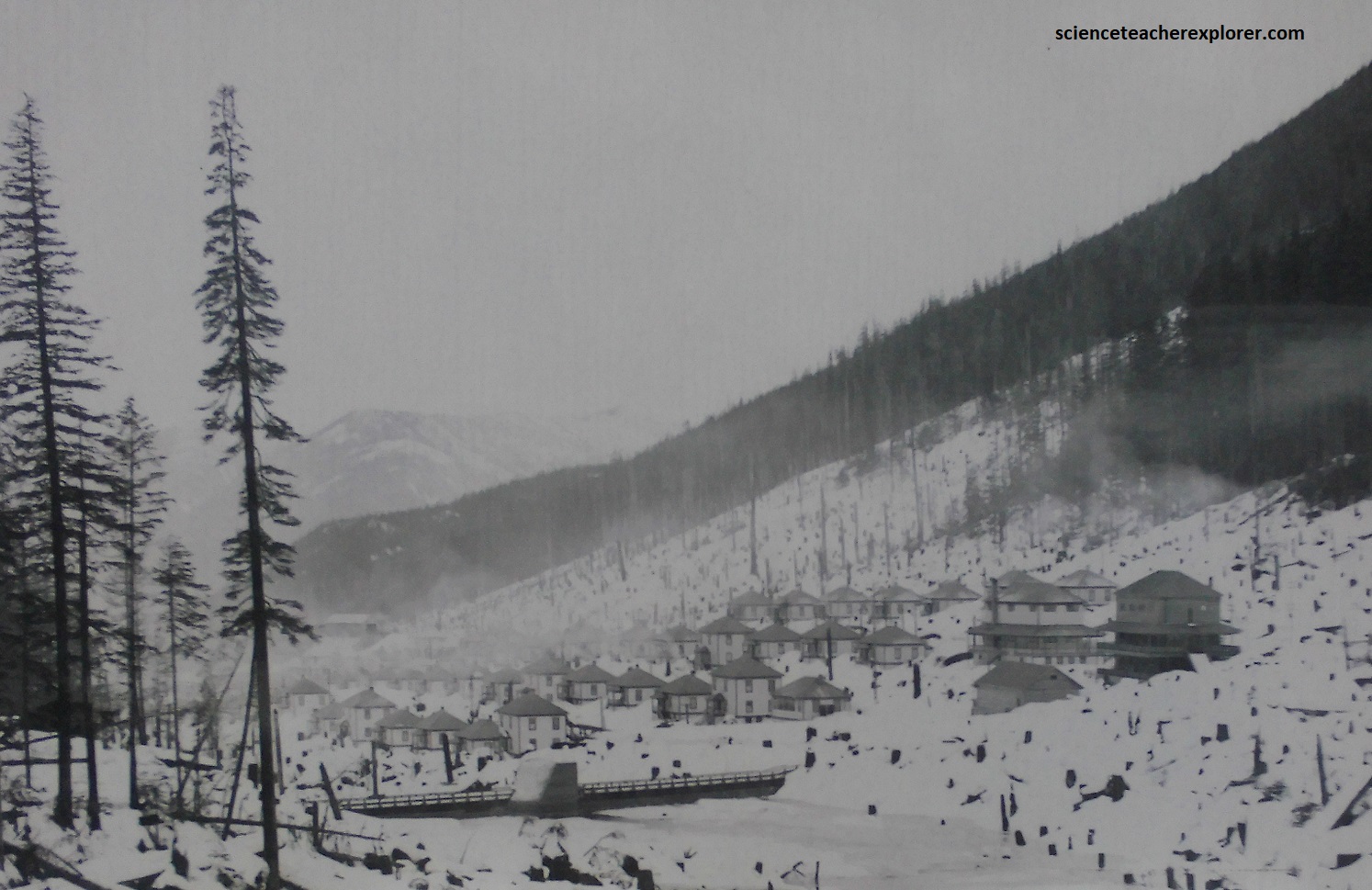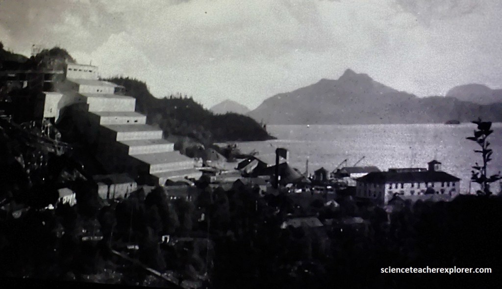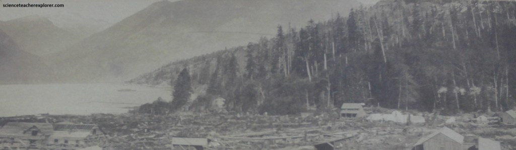 In 1904, a gravity concentrator was installed at the site, capable of processing 200 tons of ore daily with an output concentrate of about 10% copper. However, most of the high-grade ore at Britannia Beach had been mined and milled by 1912. To maintain profitability, the mining operation was expanded to mine low-grade ore, requiring a new wooden concentrator, (pictured above), built in 1914 & 1915. So, between the years 1905 and 1915 the mine increased production by a factor of ten. However, disaster struck on March 22, 1915, when a huge landslide killed 56 people.