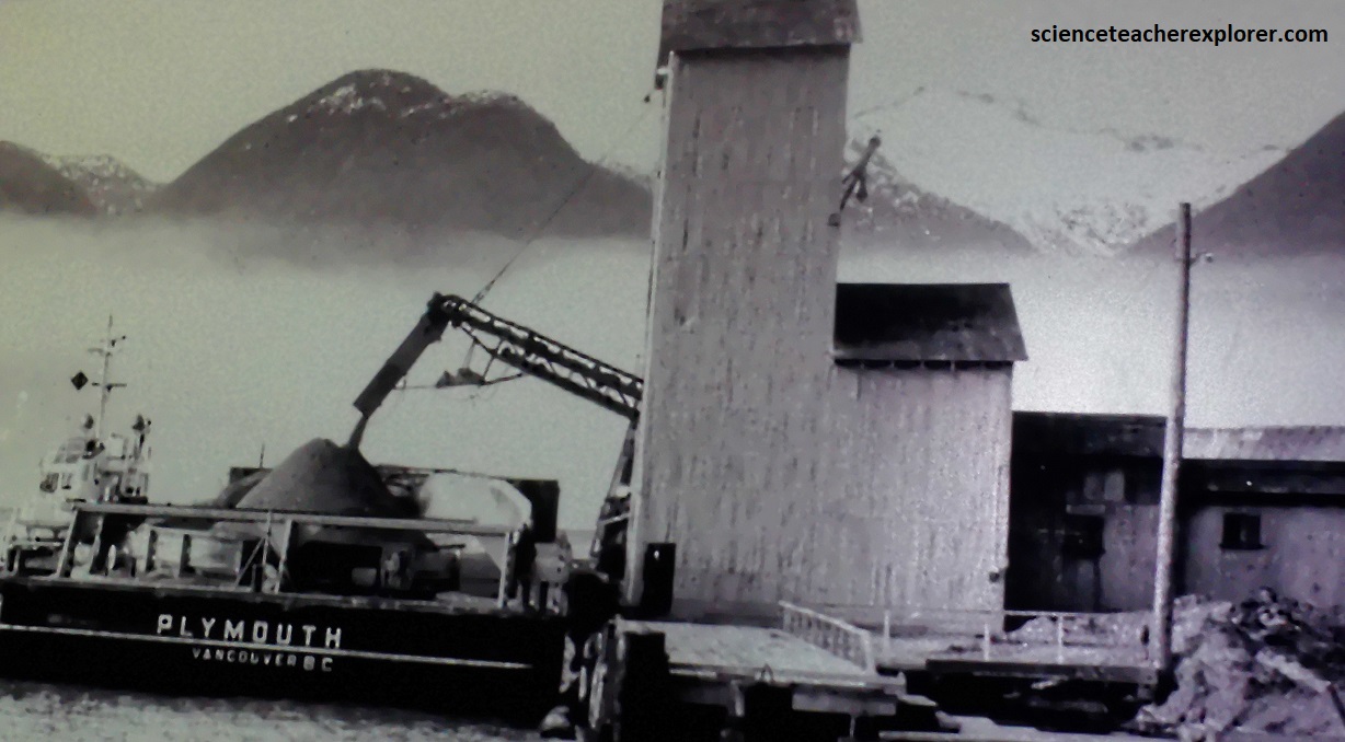 The Britannia Mine was a copper mine. Following World War II however, copper prices were so low that it was not economical to mine copper here. So the Mine took a gamble. Zinc was mined, (found in a mineral called sphalerite ZnS). Separating the sphalerite from the waste rock involved the use of chemicals such as copper sulphate. Copper went from being the product, to being an ingredient. Making copper sulphate here helped to cut operational cost. This contributed to the success of the zinc mining venture. {Process: (1) Soak copper in ammonium hydroxide for 2 days. (2) Remove the copper and allow it to oxidize for 24 hrs. (3) Grind the oxidized copper. (4) Place ground oxidized copper in 10% sulphuric acid solution for 2 hrs. and agitate with air. (5) Recover copper sulphate crystals and reuse unreacted copper.