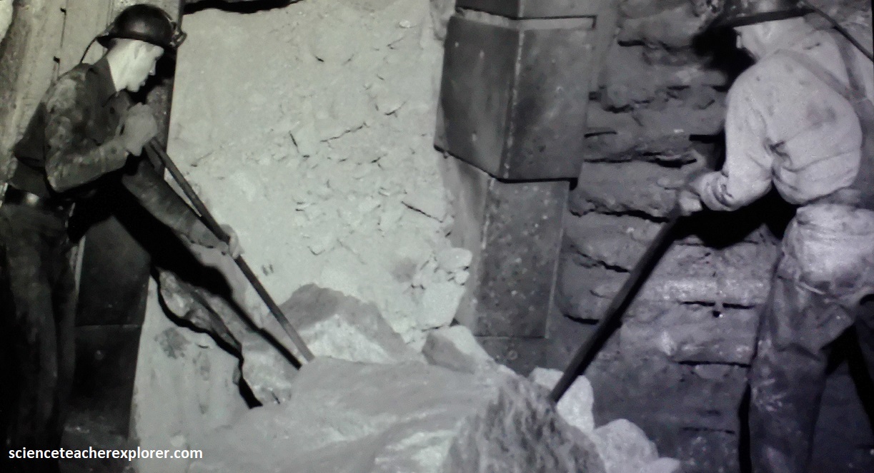 Pictured above, a young man demonstrates the use of a pneumatic air-drill. Early techniques involved hand tools like hammers and chisels, which eventually evolved into high-powered pneumatic air drills. These were used to drill holes for explosives to blast the rock. {Pictured below are historical photos (taken from an interpretive sign on-site) of miners working the pneumatic drills & mucking up after}.
