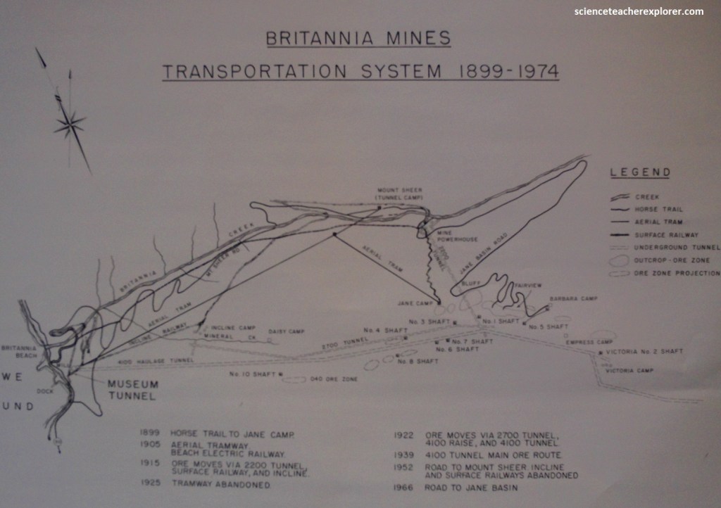 The longest tunnel is 16km long, (an amazing feat for it’s day). If all the tunnels of the mine were laid out end-to-end, they would stretch from Vancouver to Seattle. The mine sat inland beneath the Britannia Mountain Range. This mountain was riddled with 210km of tunnels. From top to bottom the mine measured 1750m. While tunnels were not driven under the Howe Sound, the mine reached 600m below sea level.