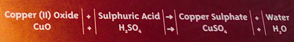 Copper oxide was needed to efficiently make copper sulphate. Here at Britannia, copper (Cu++) was recovered from the mine water and then oxidized using ammonium hydroxide (NH4OH(aq)) to produce copper (II) oxide (CuO). This made 74-80% of the copper soluble in sulphuric acid. The copper oxide then reacted with the sulphuric acid to create copper sulphate and water. (image below).