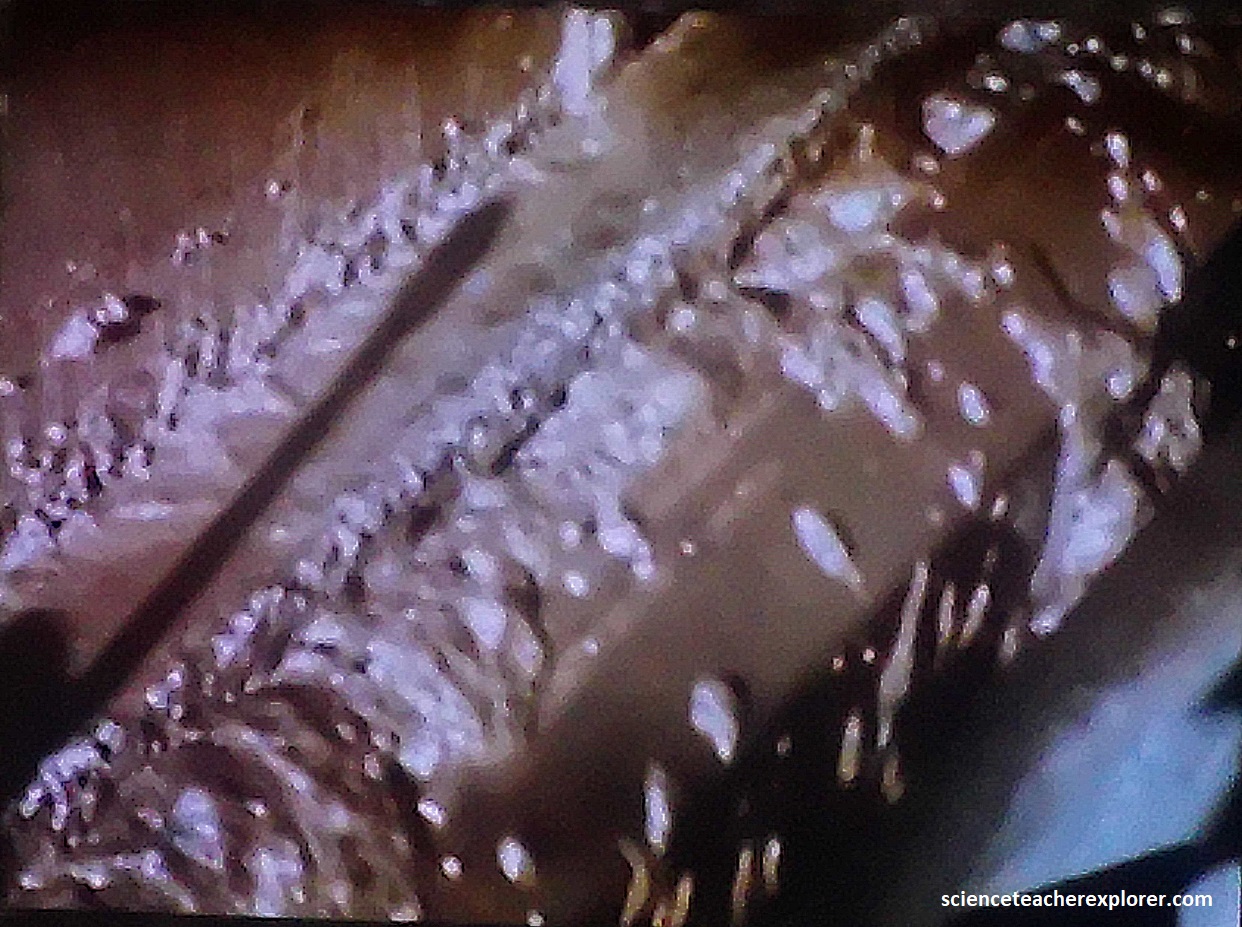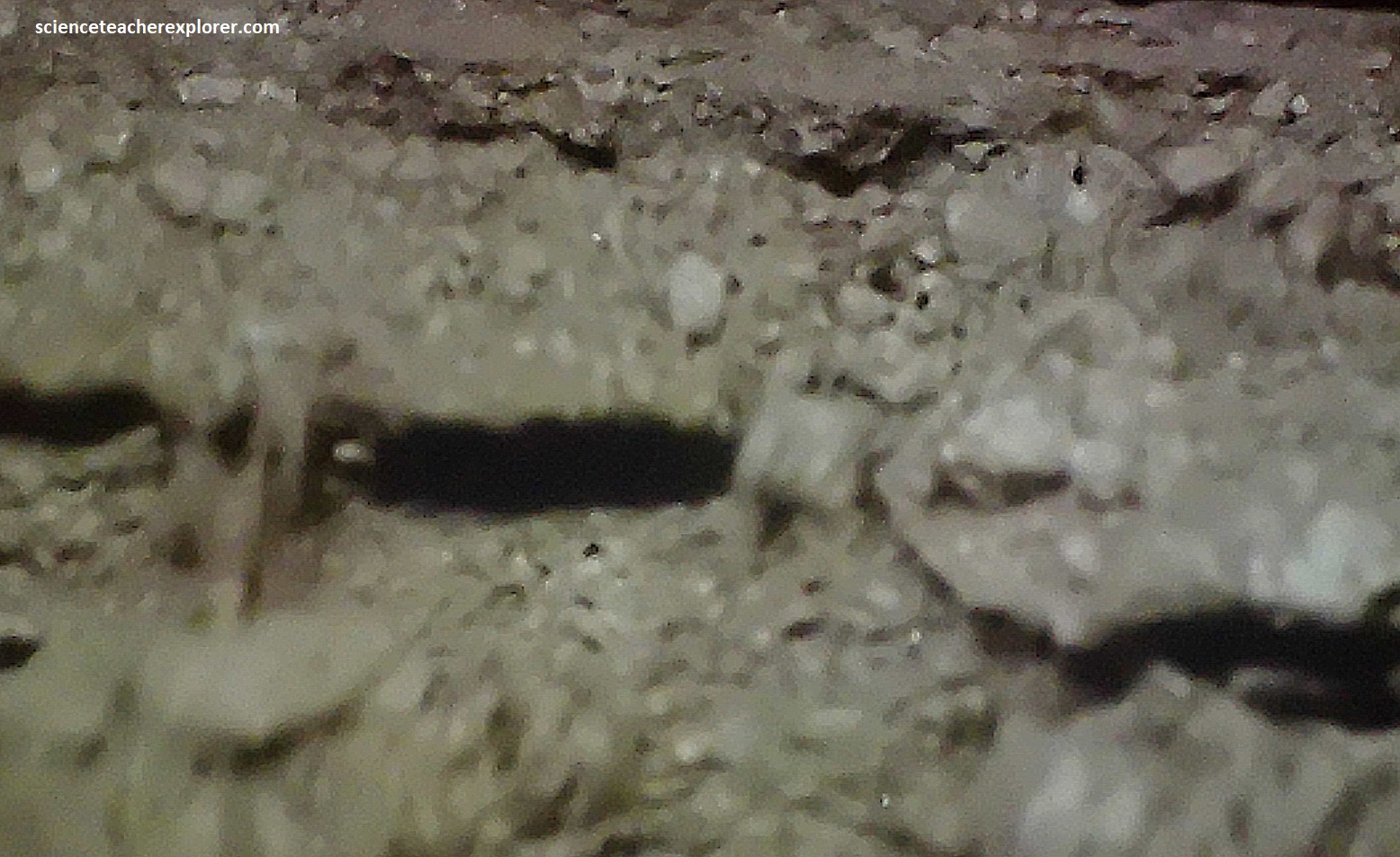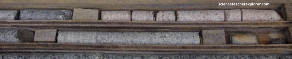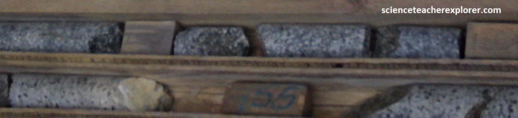 Core from a drill is read like a book, from left to right, top to bottom. Pictured above, wood markers indicate the depth where the core broke during drilling or core was lost. Core is lost when the drilling causes the rock to crumble into sand or clay. Geologists begin by visually inspecting the core for signs of mineralization. If any is found, half of the sample is use to determine the mineral contents while the other half is kept in the core box as an exploration record.
