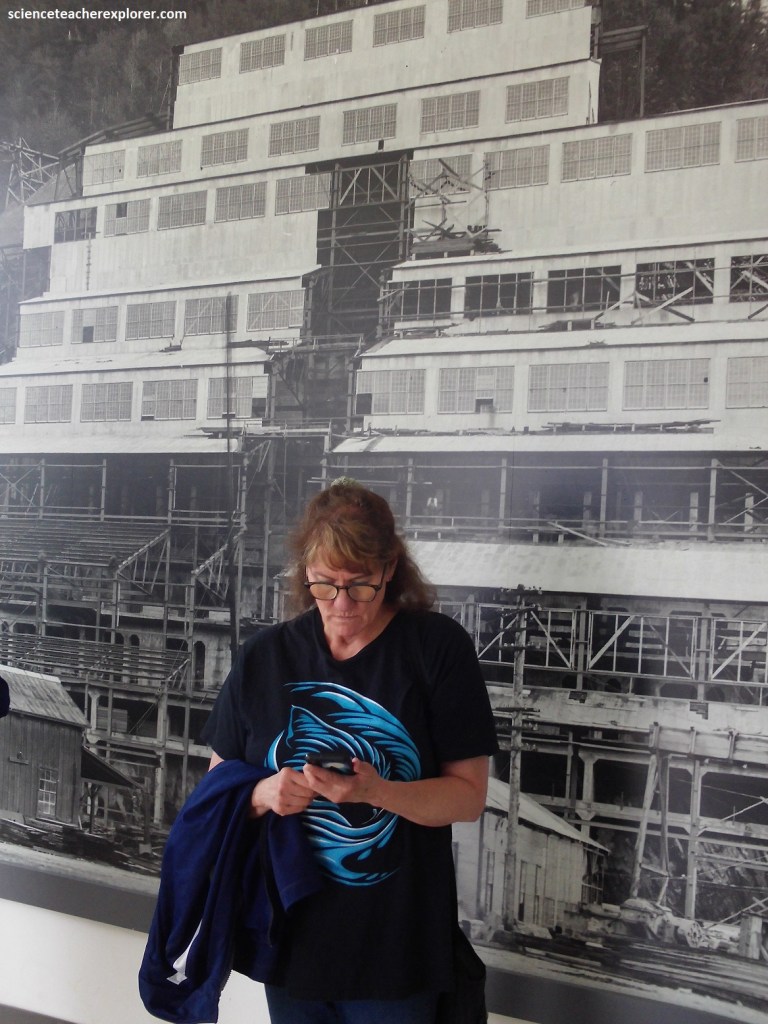 Pictured above, eventually the steep terrain of Mount Sheer was used to generate hydroelectricity, which powered the mine’s massive ventilation fans, pumps, motors and electric lights for the mine and concentrator-mill. This is when Becky and I went into the massive ‘Britannia Mill-site’, (pictured below).