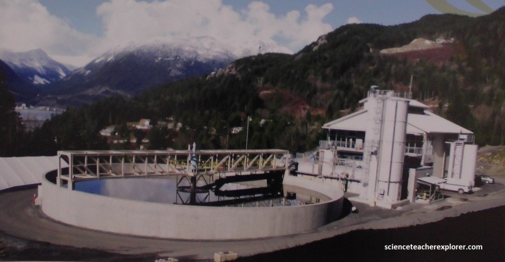 In 2004, the B.C. government selected EPCOR to finance, design, build, and operate a Water Treatment Plant at Britannia Beach. Water from the mine’s tunnels is directed into the water treatment plant. Lime slurry is added to the acid rock drainage to bring the pH between 6.5 and 9.5. This also makes the metals come out of the solution. In the next tank, a man-made customized polymer is added which attracts the metal particles. These heavy particles sink to the bottom of the tank and the clean water is removed from the top. The water from the lime slurry + mine water mixture is removed to make a dry sludge ‘cake’, (twice a year this ‘sludge’ is taken up to Jane Basin).
