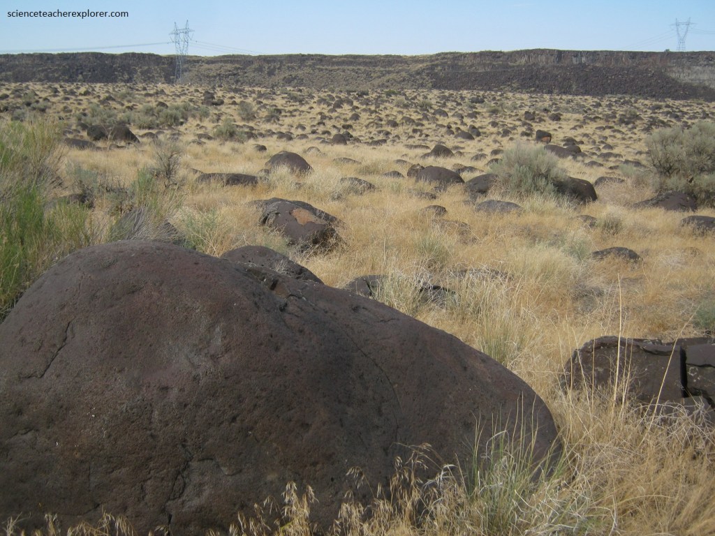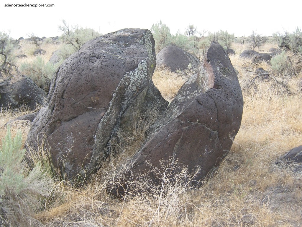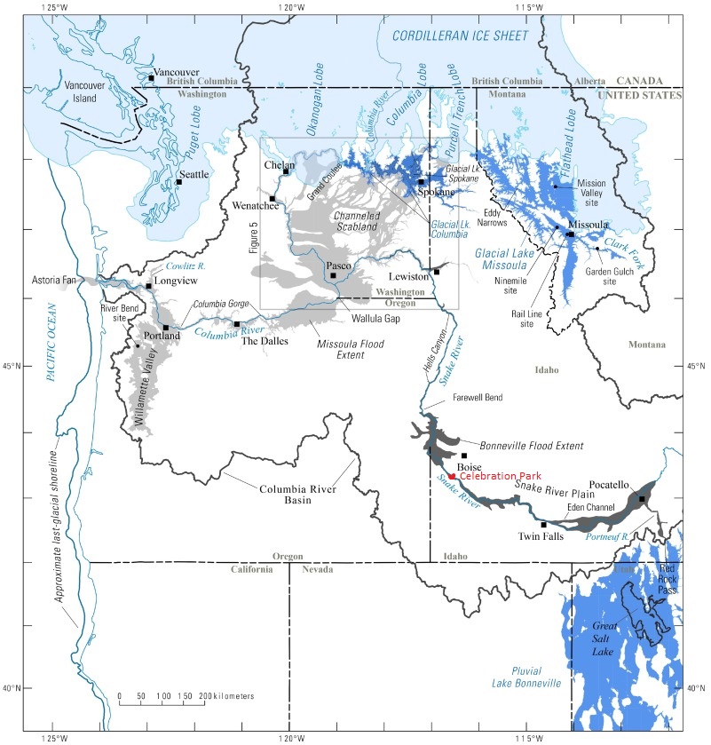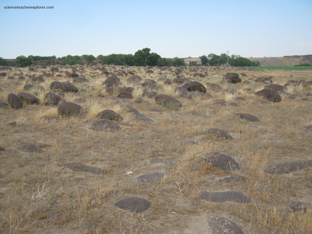 Pictured above, the immense power and magnitude of the Bonneville Flood are on display at “Celebration Park”. Lake Bonneville, the enormous precursor to modern Great Salt Lake in Utah, overflowed into Idaho about 17,500 years ago. Picture above, the boulders are polished by countless collisions during tumbling in the floodwaters of the Bonneville event.