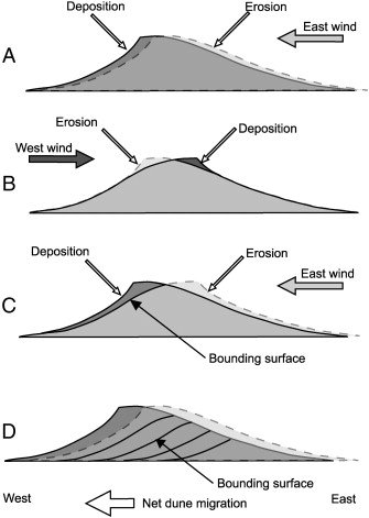 Pictured below, ripples are essentially miniature dunes that form perpendicular to the wind direction. The distance between ripple crests is determined by the size of the grains and the wind speed, (with stronger winds and smaller grains the crests are farther apart).