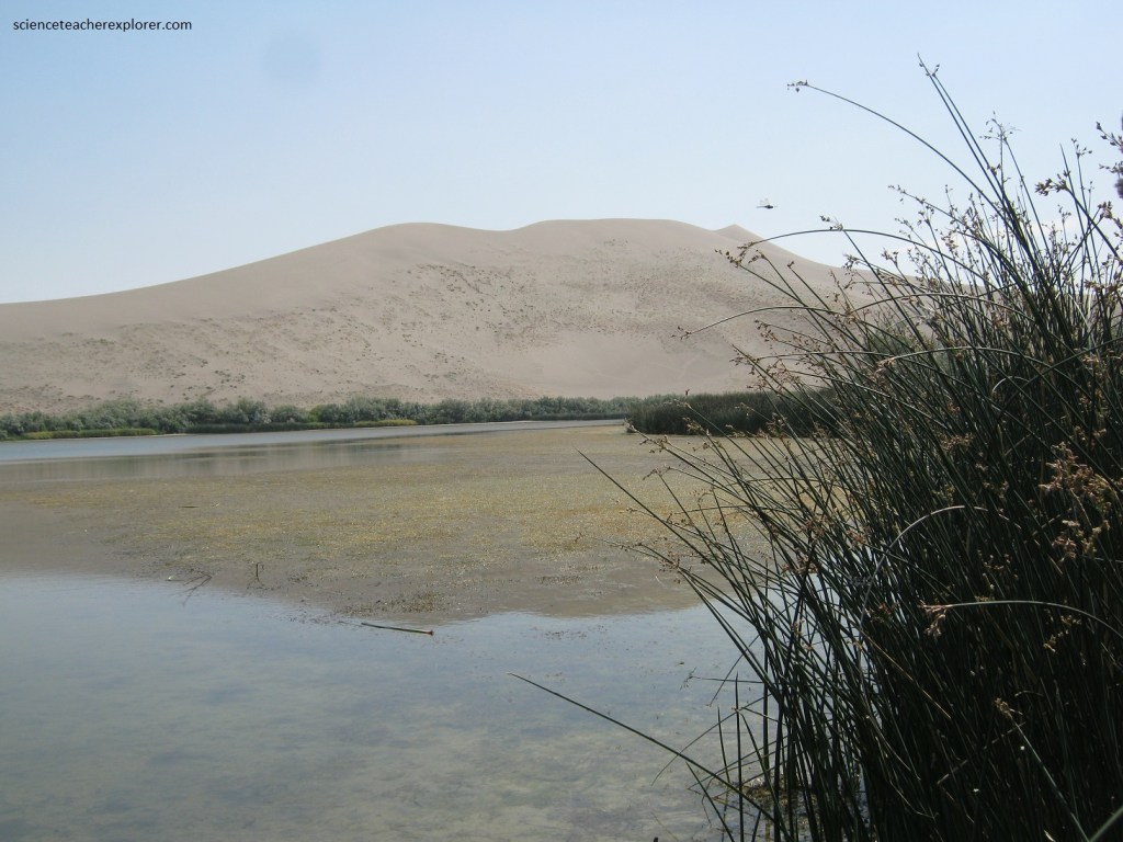 Pictured below, the lakes are a consequence of human activity. The nearby CJ Strike Dam, constructed in the 1950s, impounded the Snake River and formed a reservoir upstream of the dam. As the river level behind the dam rose, the subsurface water table followed suit, rising high enough to flood low areas, such as these small basins near the dunes.