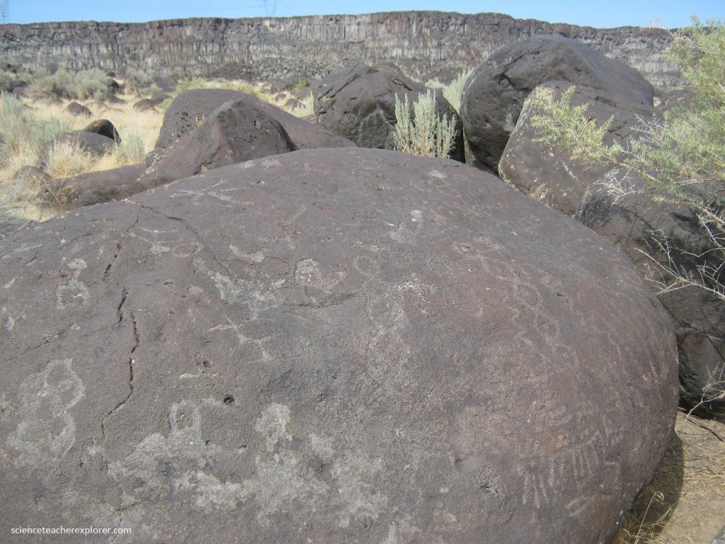 Pictured below, thousands of years ago, Native Americans hunted, fished, and camped along the Snake River, leaving a record of their passage by carving thousands of petroglyphs on Melon Gravels boulders. The images on this boulder were made particularly visible because the inscribing penetrated the thin, dark surface of the rock, revealing the lighter color of the rock’s interior. The hard, dark coating is known as desert varnish, (an ultrathin deposit of tiny clay minerals cemented by manganese and iron oxides).