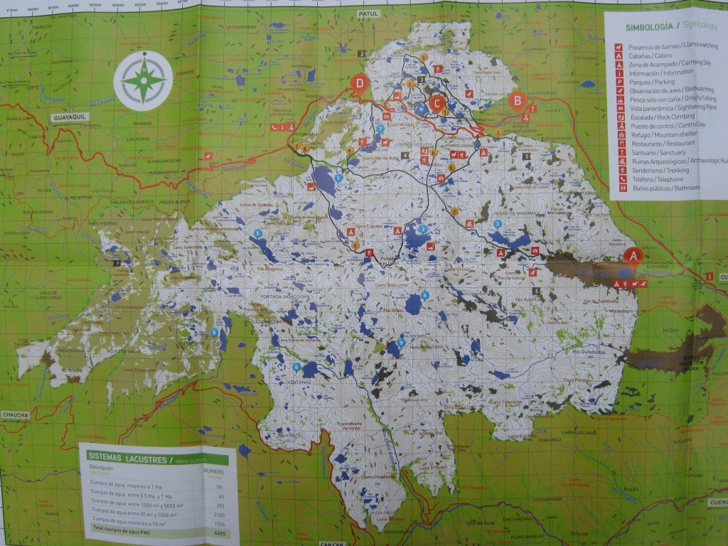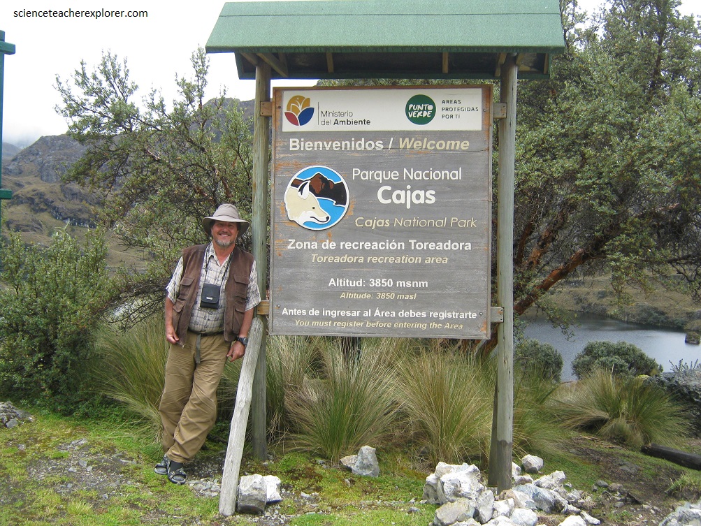 Imaged above, Cajas National Park is located between 3150 – 4445 meters above sea level in the narrowest part of the Andes. We approached the park in a rented vehicle by way of the main entrance and by the road that connects Cuenca with the coast: Cuenca – Molleturo – Naranjal. This road crosses the Park and is the most visited area of the park, where one also finds a small but well-done modern visiter center, at a short distance from Lake Toreadora, which is visible from the road, (pictured below). It was only located about 30 km west from Cuenca, the capital of the province of Azuay.
