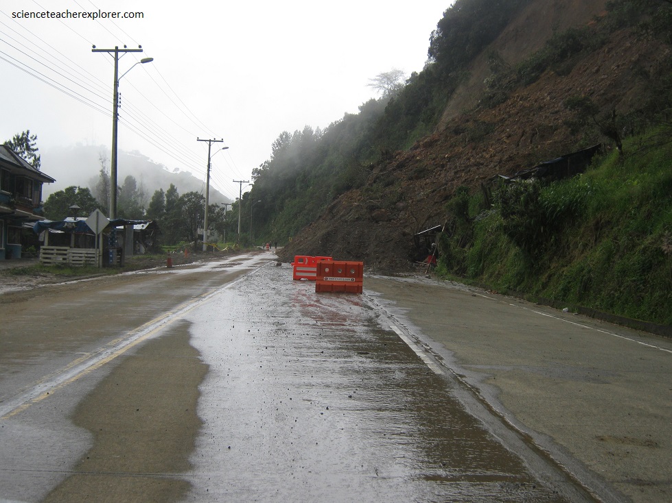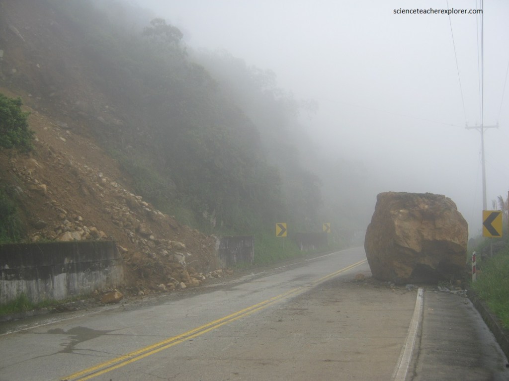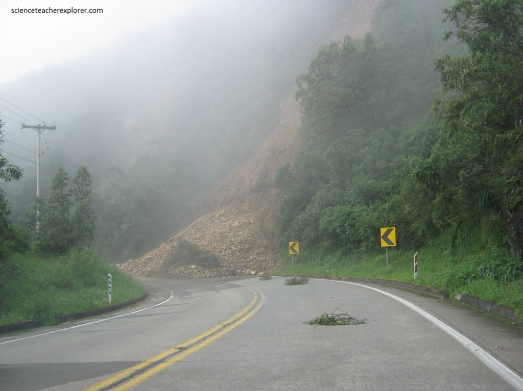 After we passed the Tres Cruces of the continental divide, the rain started. Since the elevation dropped into the “cloud forest”, then the landslides became abundant across the coastal highway. As a matter of fact, once a landslide covered road, we had no choice but to turn back towards Cuenca, (pictured below).