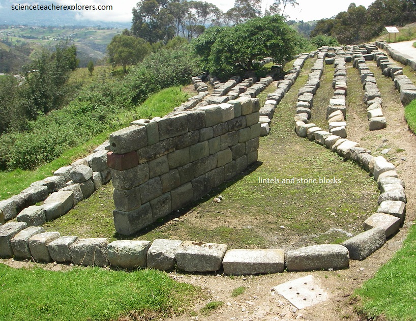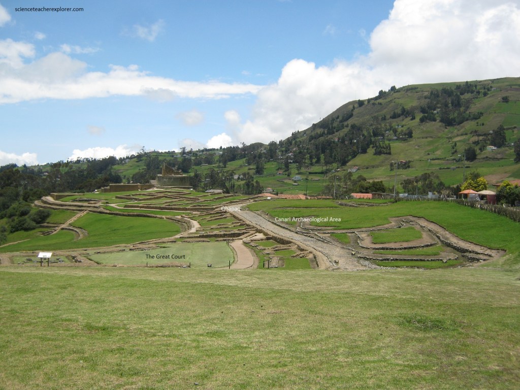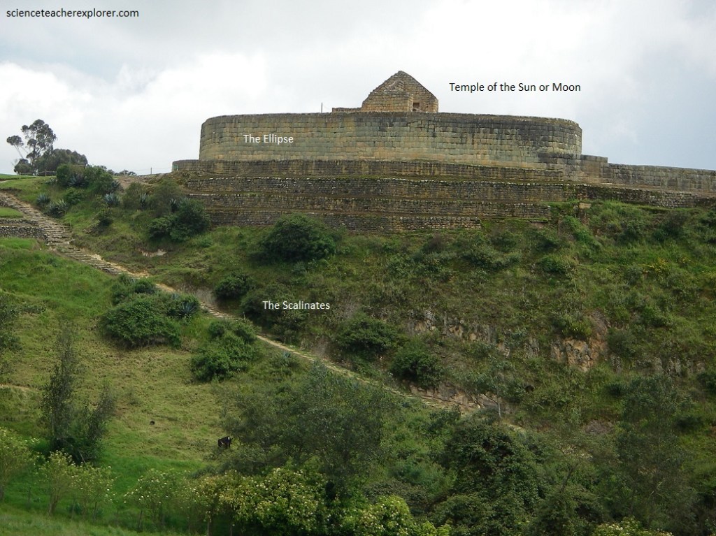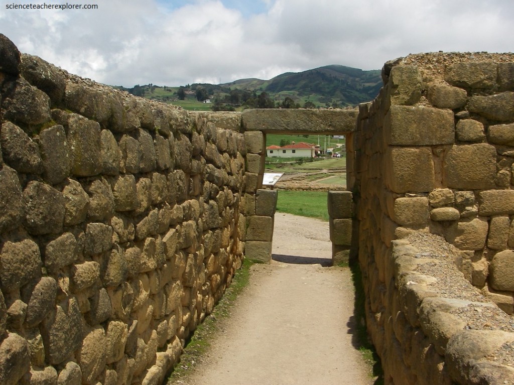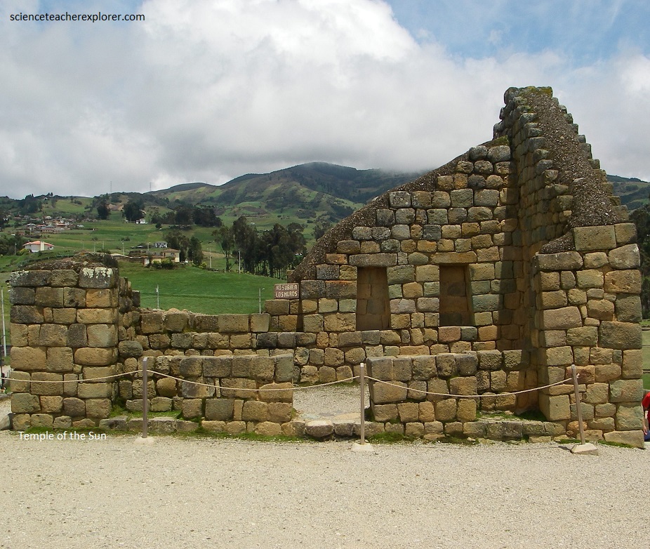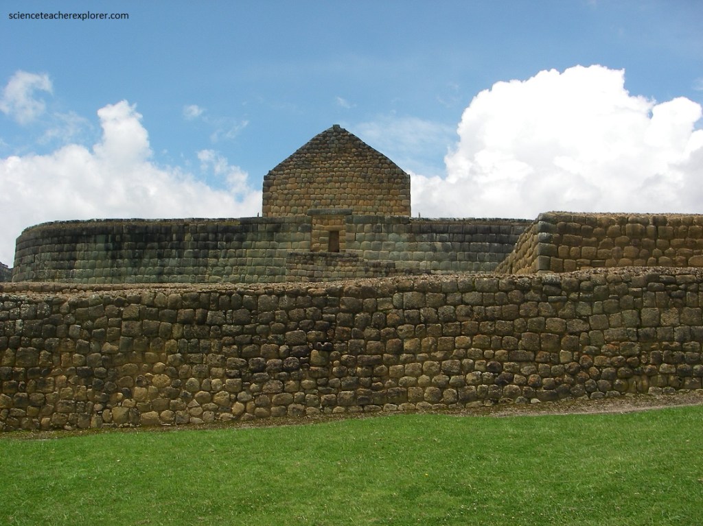Pictured above, “the Ellipse or Temple of the Sun” is a superimposed and attached to a ceremonial Canari rock called Pacarina. It is a strcture of an elliptical tower, the only one in the Tahuantinsuyo (the name of the four regions of the Inca Empire). It is considered as the ultimate expression to the Inca’s architecture in Ecuador. This is because of the perfect fit for the pill-shaped blocks, as well as the trapezoidal ornaments known as niches.