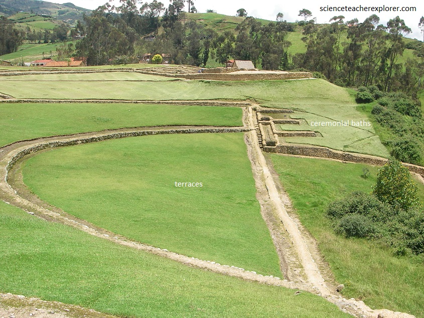 Pictured above, the “Ceremonial Baths” is a place made for the purpose of a “bathroom” or “water source” with its respective channels as water pipes. [It was built for ceremonial purposes]. The “Terraces” are walls that, following the curves and topography of the land, are areas for agricultural use.