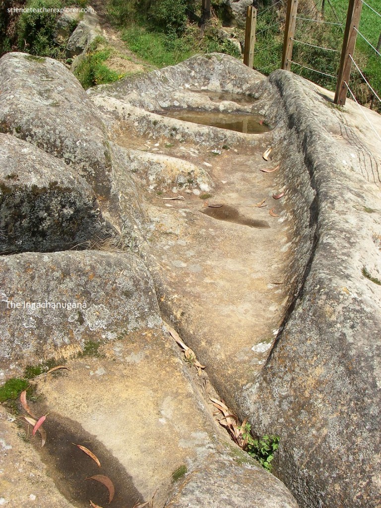Pictured above, “Ingachungana”, northeast of the Temple, (a natural rock outcrop), is a deposit of two flat bottom cavities carved in the rock, whose edges are of two stylized snakes that are intertwined with other. This makes the place a site of ritual characteristics. The locals commonly call it an “Inca game”.