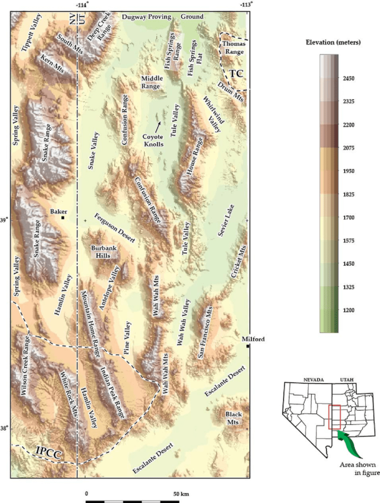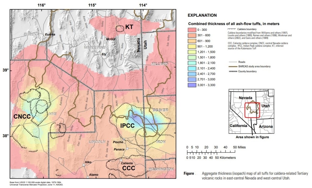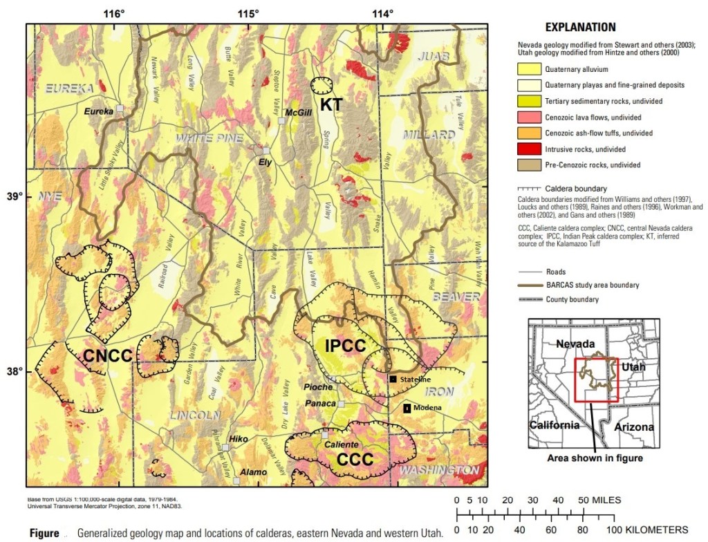 Imaged above, between about 30 and 25 million years ago, caldera-related eruptions from two major centers, the “Indian Peak Caldera Complex” and the “Central Nevada Caldera Complex”, formed a broad zone of voluminous upper Oligocene–lower Miocene volcanic rocks that extended across southern Nevada and Utah. The “Caliente Caldera Complex”, about 80 km to the south, erupted several thousand cubic kilometers of volcanic material between about 23 and 19 million years ago. A smaller volume, not important our exploration area, an ash-flow tuff formed called the Kalamazoo Tuff.