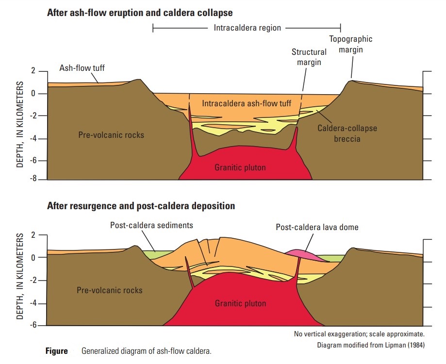 Calderas form when large volumes of magma are nearly instantaneously erupted from shallowly emplaced magma reservoirs in the form of a volcano. As an eruption of this type ensues, the associated magma reservoir is partially evacuated by the eruption of frothy magma, and the central block of roof rock that lay above the reservoir collapses downward along a series of faults. The resulting system of faults forms a generally circular system of normal faults that constitute the caldera’s structural margin.