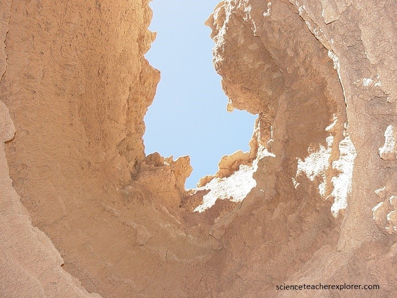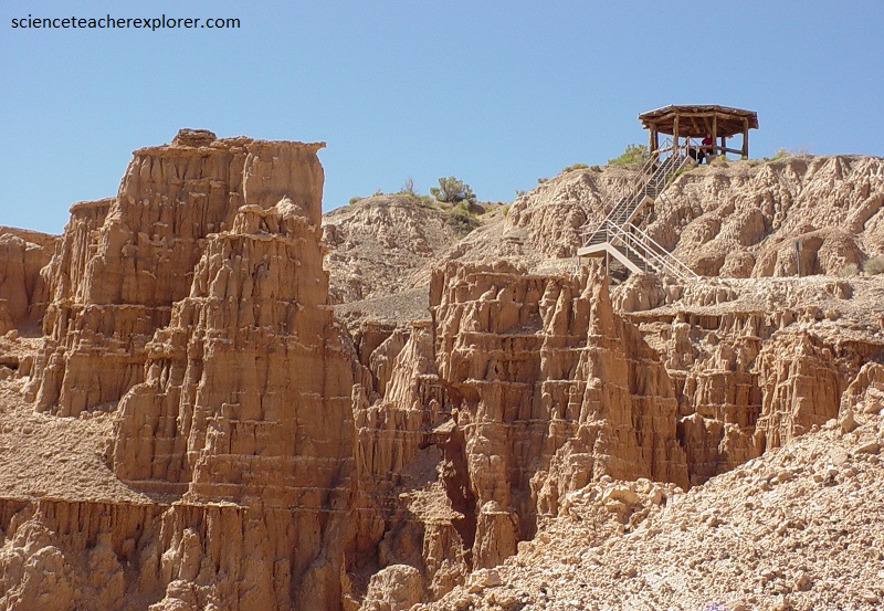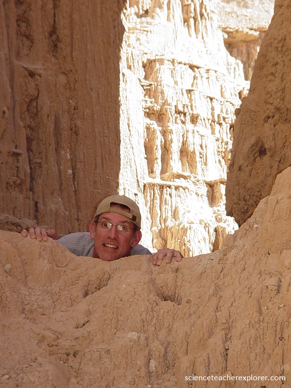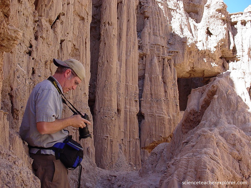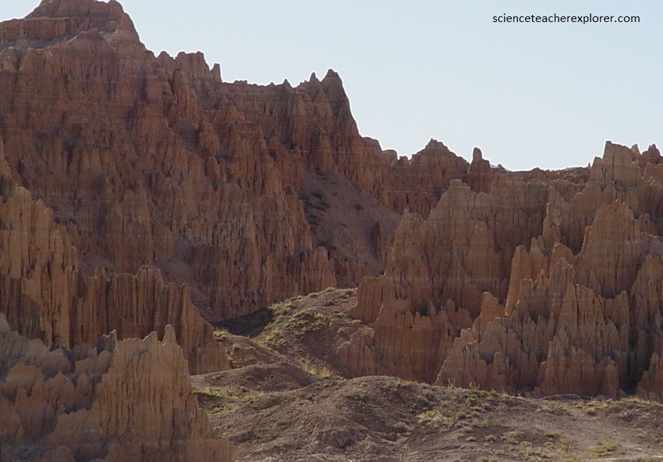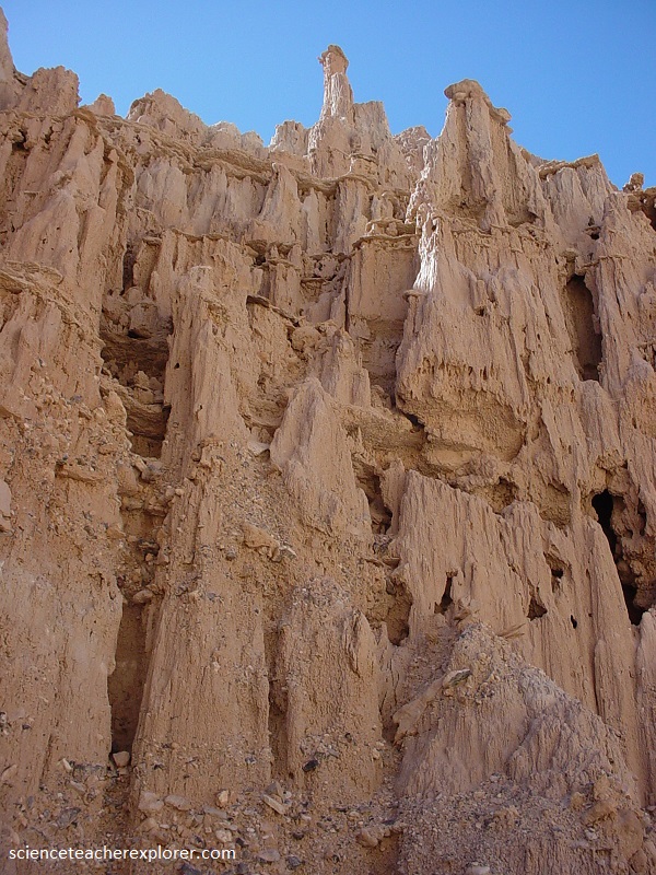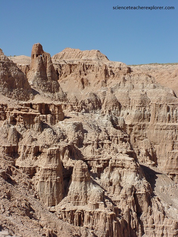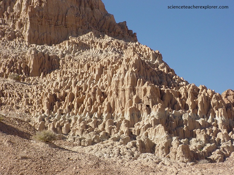 The underlying rock at Cathedral Gorge is the “Panaca formation”. The Panaca formation contains much montmorillonite clay, (a mineral derived from the alteration of volcanic ash). This type of clay mineral absorbs moisture from rainfall and swells. Upon drying, the clay surface crumbles and shrinks, leaving characteristic mud cracks behind. These cracks are natural pathways for water, and they further enhance erosion.
