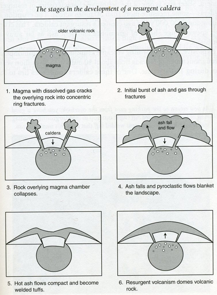 Imaged above, the outward retreat of the caldera boundary by subsequent land-sliding forms a second, more gently inclined concentric discontinuity above sedimentary layering, known as the topographic margin. Simultaneous with central collapse and landslide formation, the evolving central depression begins to be filled by the volcanic products derived from the ongoing eruption. This rapidly evolving intra-caldera environment is usually filled by a kilometers-thick accumulation of ash-flow tuff and interleaved landslide materials throughout the area, (imaged below).