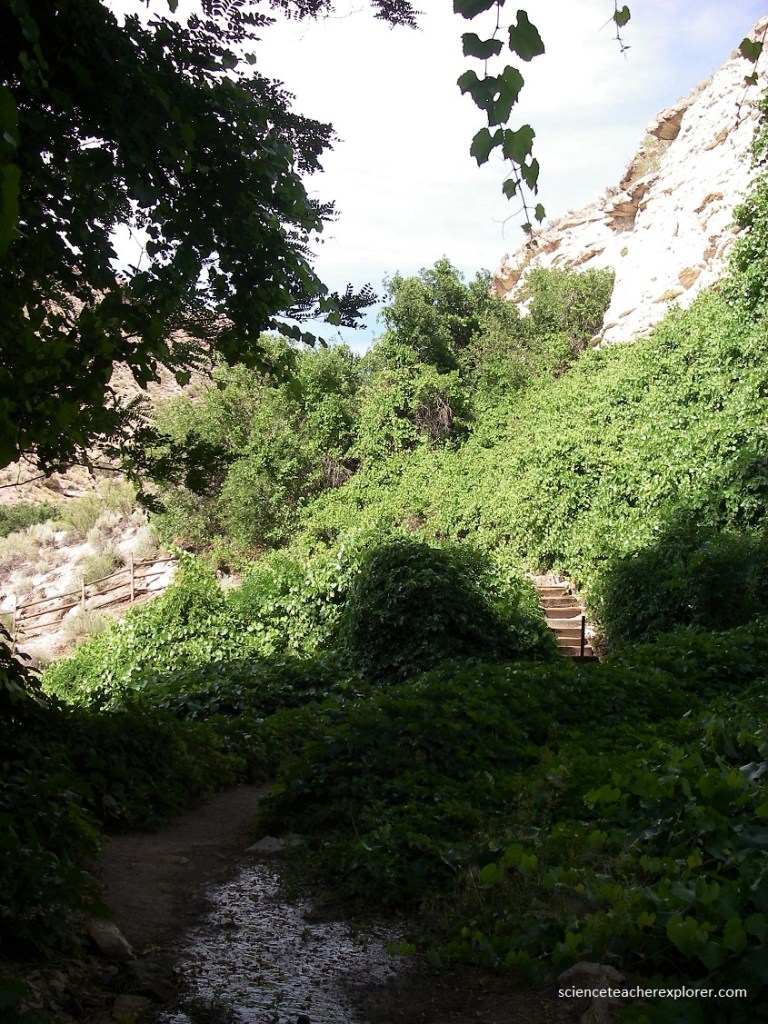 Pictured above, the streams that intermittently flow within these deeply incised channels often disappear into or reappear from holes in the floor or ceiling. This is a process called piping. Pictured above is a hole that is about a meter in diameter, through which water has flowed. Water percolating through the Panaca formation follows natural cracks of weakness and erodes sediment, carving small tunnels. Flowing water then enlarges the passageways, undermining portions of the rock. Eventually piping causes the wall to collapse, further exacerbating the already rapid erosion.