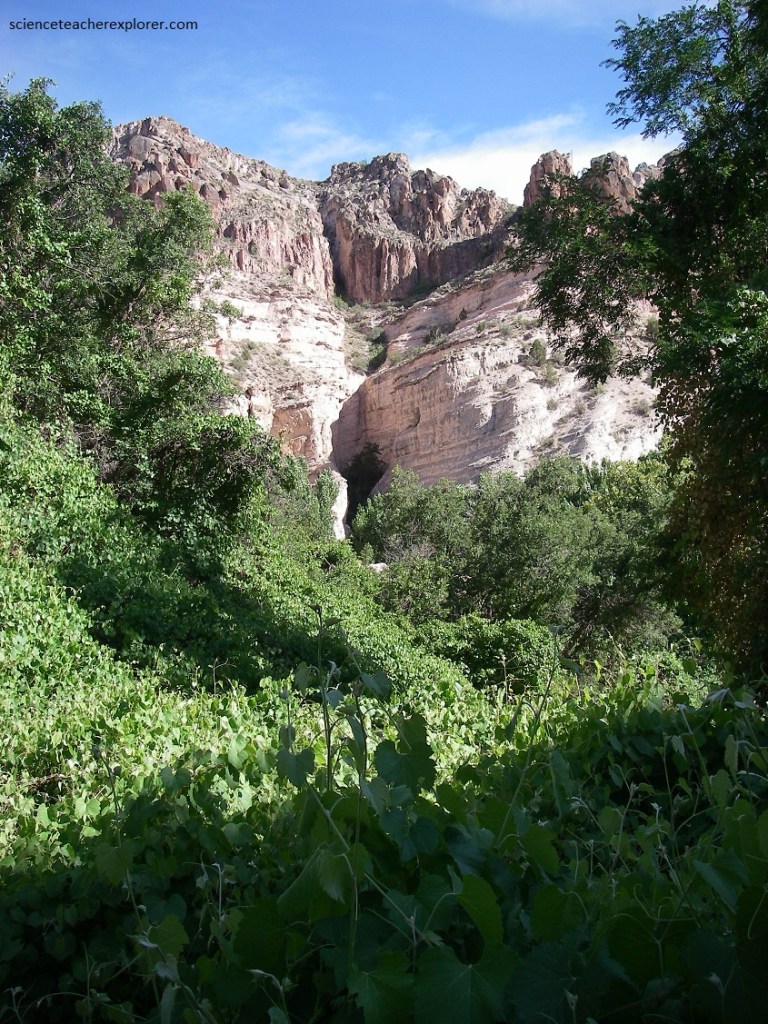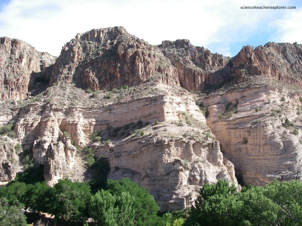 Pictured below, the pinkish, crumbly rock unit that we see on the cliffs are the volcanic tuff mentioned before. It is a type of volcanic rock known as an ignimbrite, or ash-flow tuff, born of a particular violent style of volcanic eruption. The eruptions resemble the 1980 eruption at Mount St. Helens, but on a much grander scale, (2,000 times the volume).