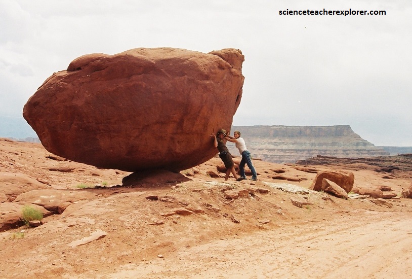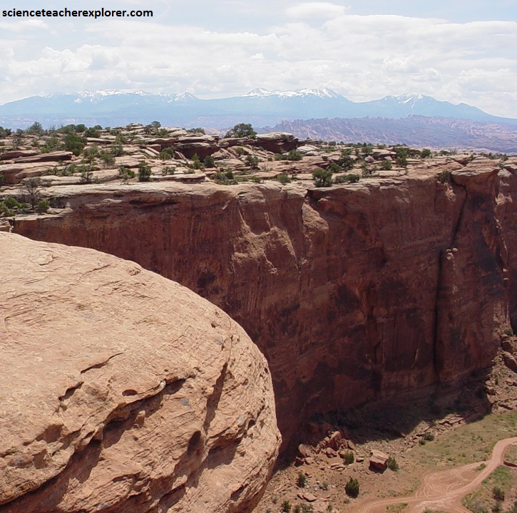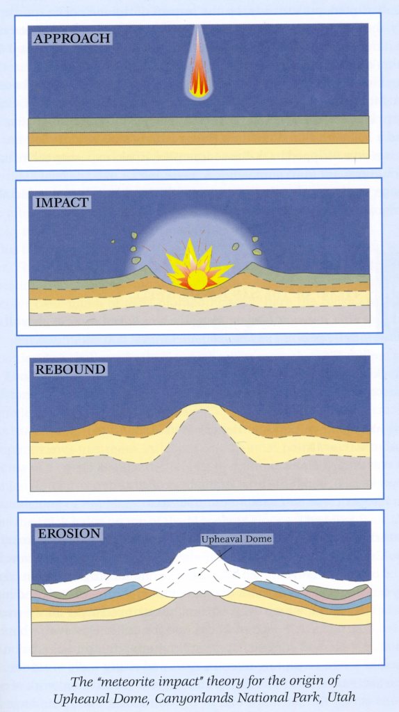 Pictured above, The “Upheaval Dome” in Canyonlands National Park, is a colorful circular “structure,” unique among the broad mesas and deep canyons of the Colorado Plateau, (it looks like a crater). The rim of Upheaval Dome is 4.5 km across and over 330 m above the core floor. The central peak in the core is 1000 m in diameter and rises 250 m from the floor. The core consists of the oldest rock formations at Upheaval Dome. The Organ Rock Shale and White Rim Sandstone of the Permian Cutler Group, and Triassic Moenkopi Formation were injected and pushed upward in a chaotic jumble. The Triassic Chinle Formation, Triassic-Jurassic Wingate Sandstone, and Jurassic Kayenta Formation and Navajo Sandstone are stacked, oldest to youngest, from the core to the rim. In 2007, German scientists Elmar Buchner and Thomas Kenkmann reported finding quartz crystals that were “shocked” by the high pressure of a meteorite impact.