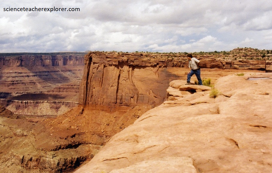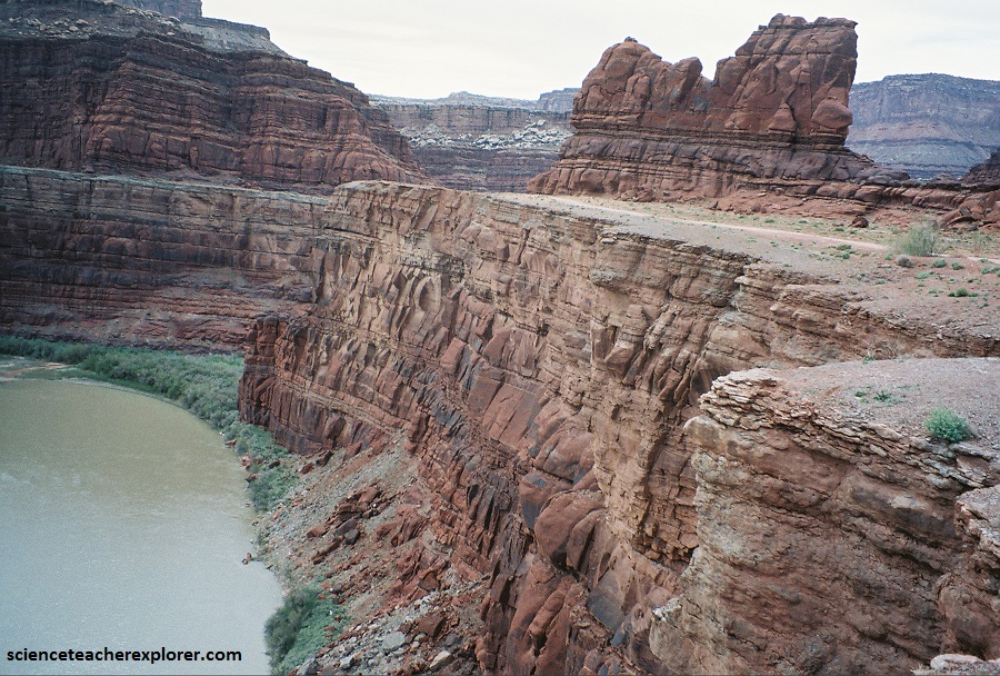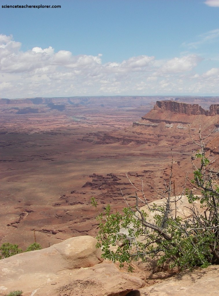 Canyonlands National Park preserves a rugged landscape of colorful sandstones eroded into a showcase of geological wonders. Rivers divide the park into four distinct areas: The Island in the Sky, the Needles, the Maze and the rivers themselves. This webpage focuses on “The Island-in-the-Sky”. “The Island-in-the-Sky” is a 2,000 foot-high mesa overlooking the Green River to the west and the Colorado River to the east. Layers of sedimentary rock are visible down the steep walls of canyons cut from the top of the mesa to the rivers far below, exposing roughly 150 million years of geologic history.